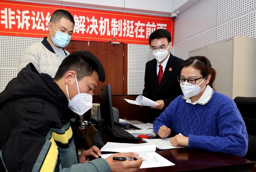 1月21日,山東省棗莊市市中區(qū)人民法院金融法庭法官助理和人民調(diào)解員正在給當(dāng)事人辦理訴前調(diào)解法律文書(shū)。當(dāng)日,市中區(qū)人民法院金融法庭的法官和人民調(diào)解員堅(jiān)守工作崗位,對(duì)有調(diào)解意向的4起金融案件進(jìn)行訴前調(diào)解。