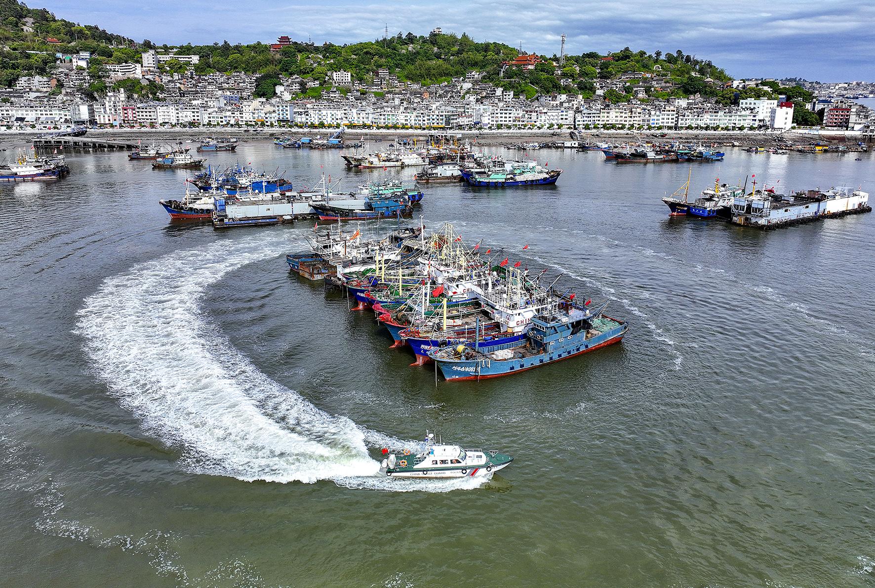5月5日,福建省寧德海警局福鼎工作站巡邏艇正在福鼎市沙埕中心漁港巡查。休漁期伊始,當(dāng)?shù)睾>?、海洋與漁業(yè)、海事、公安等部門強(qiáng)化聯(lián)動(dòng),大力開展專項(xiàng)執(zhí)法檢查和海上巡查,全力維護(hù)伏季休漁期間海上安全。