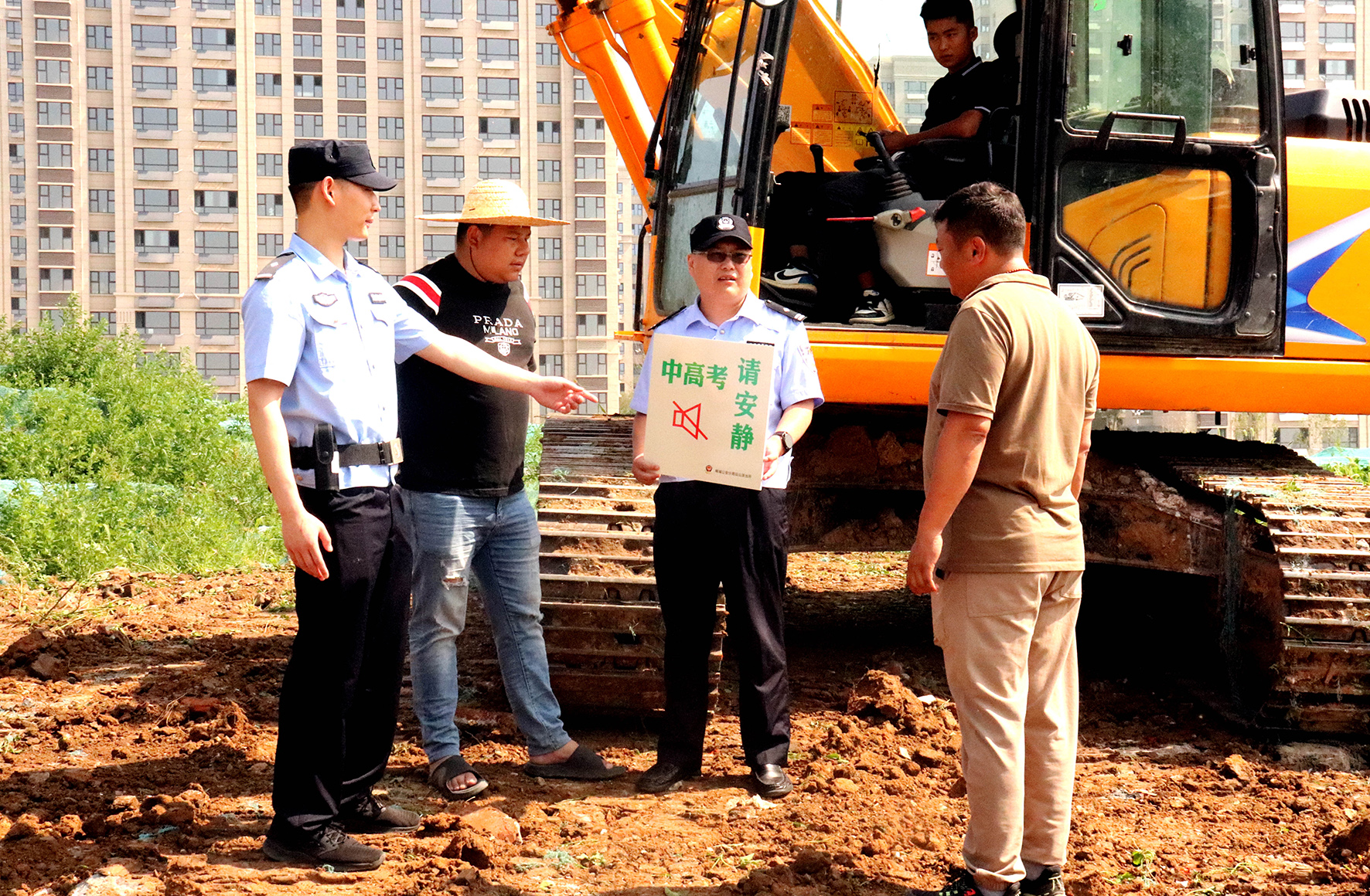 6月6日,山東省棗莊市公安局嶧城分局壇山派出所民警在施工工地宣講高考期間禁止施工和降噪降音注意事項。