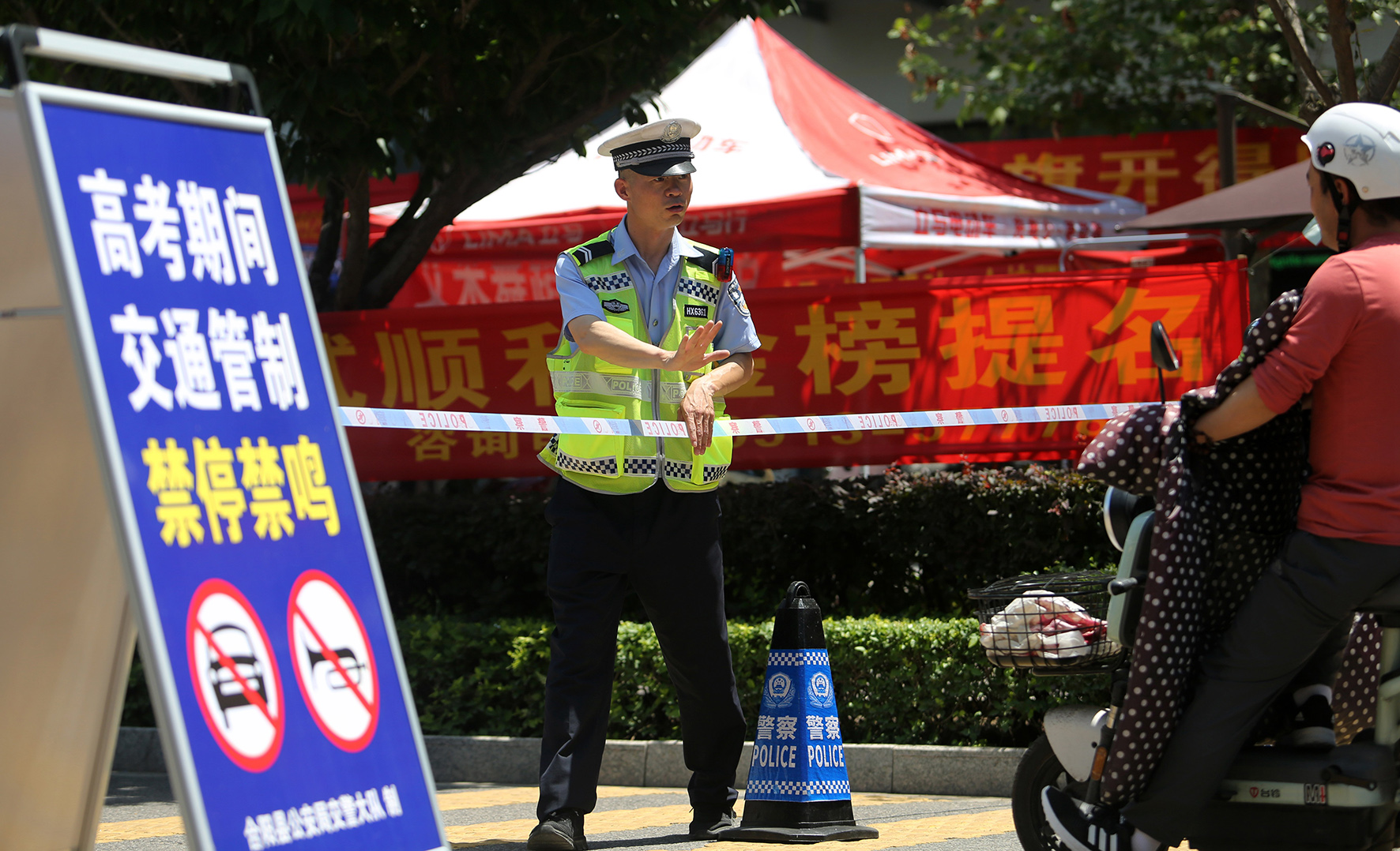 6月6日,陜西省渭南市合陽縣公安局交通管理大隊民警在合陽中學(xué)考點(diǎn)外擺放交通標(biāo)志牌,并提醒群眾高考期間請繞行。