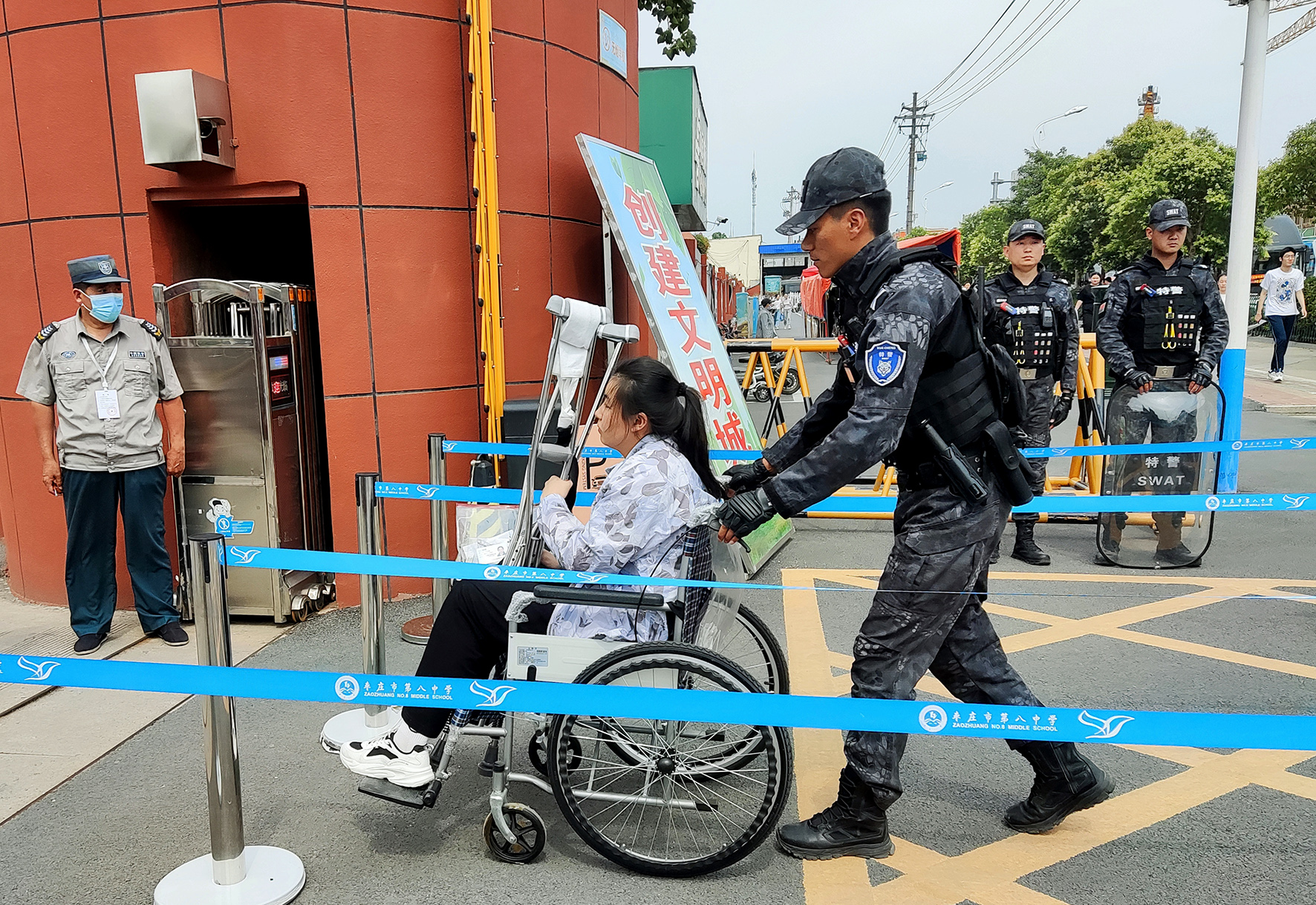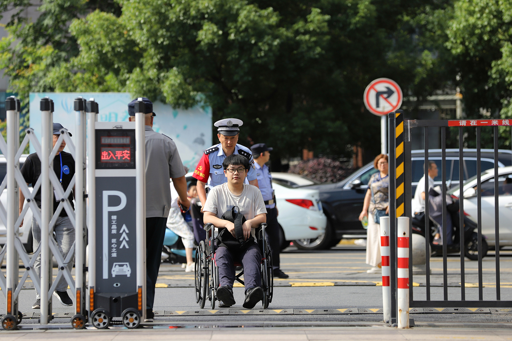6月7日,山東省棗莊市公安局薛城分局民警在轄區(qū)棗莊第八中學(xué)考點(diǎn)幫助行動(dòng)不便的考生進(jìn)入考場(chǎng)。