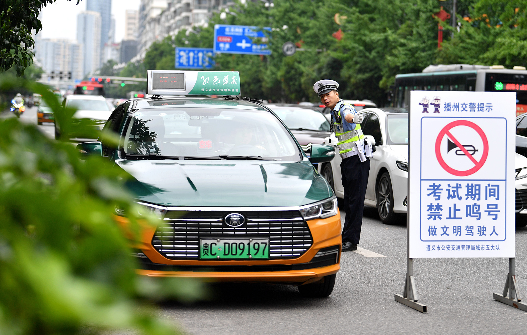 6月7日,貴州省遵義市公安局民警在各考點(diǎn)開(kāi)展治安巡邏值守、交通秩序維護(hù)、為考生提供服務(wù),全力以赴保駕護(hù)航。