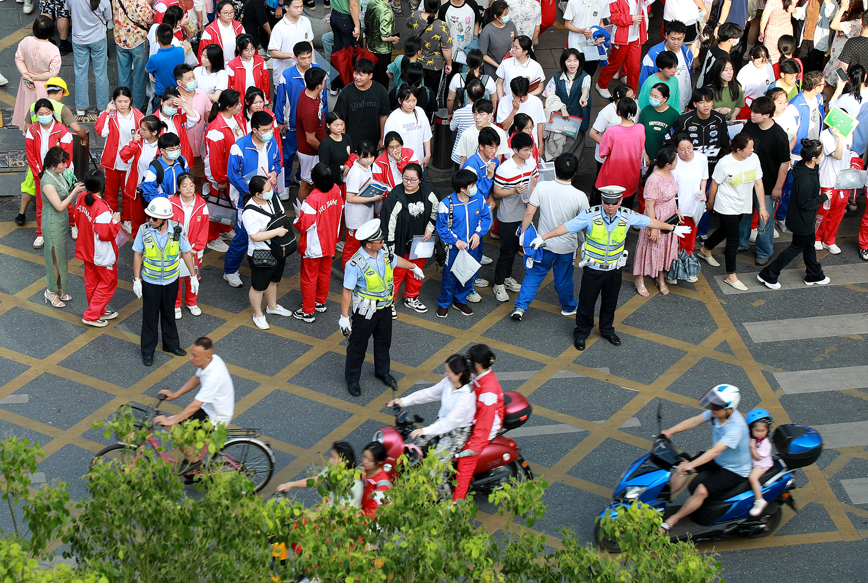 6月8日,安徽省巢湖市公安局交警大隊(duì)民輔警在維護(hù)高考考生散場(chǎng)后的路面交通秩序。