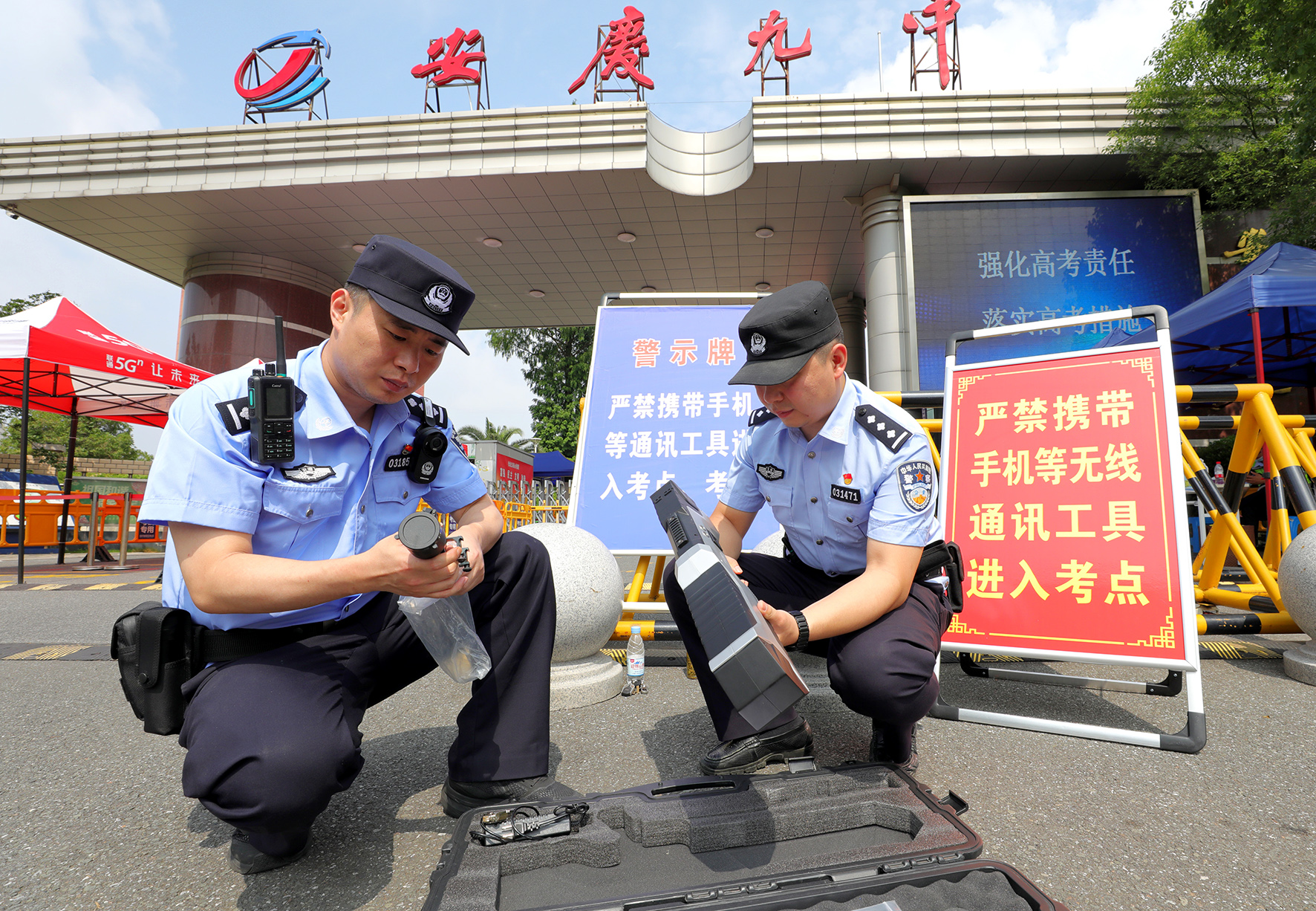 6月7日,安徽省安慶市公安局經(jīng)開(kāi)分局民警正在利用無(wú)人機(jī)反制設(shè)備對(duì)考點(diǎn)周邊進(jìn)行空中安全管控。