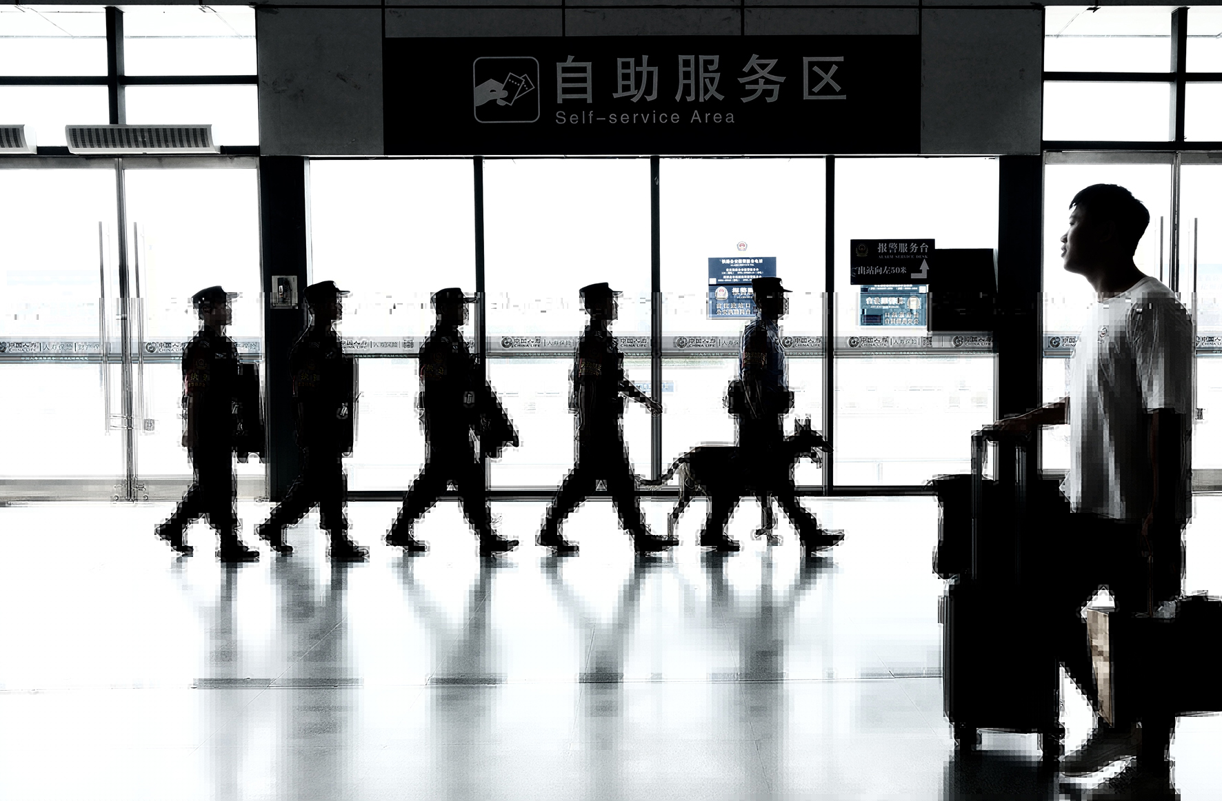 圖為8月8日,鷹潭公安處警犬工作隊(duì)民警在巡邏防控,并協(xié)同安檢查危。