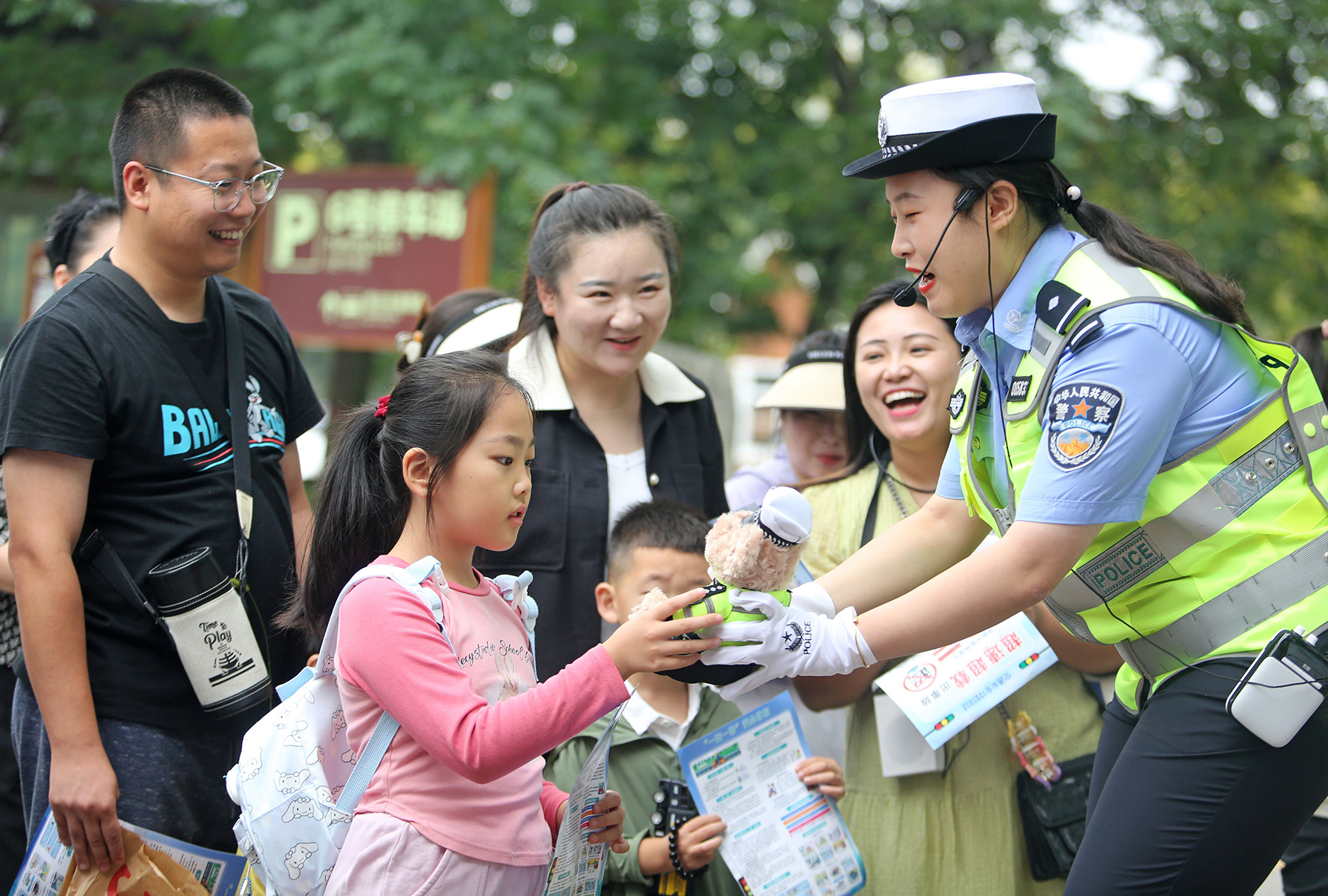 8月24日,陜西省華陰市華山景區(qū)廣場,民警為回答對問題的小朋友贈送“交警小熊”。當日,“全國百城百臺100小時”直播聯動陜西站第九場活動走進渭南華陰市、潼關縣?;顒右浴拔拿鳌儭脸鲂小ぐ踩珪秤稳亍獣承兄袊ぐ俪前倥_夏季說安全”為主題,通過直播聯動,全媒體矩陣宣講交通安全知識,傳遞交通文明理念。