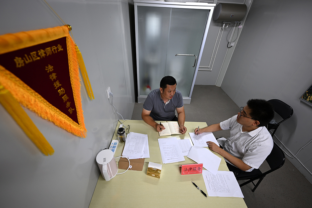 安置點(diǎn)司法工作室,房山司法局基層科科長(zhǎng)及識(shí)宇(左)與值班律師盤(pán)點(diǎn)工作重點(diǎn)。