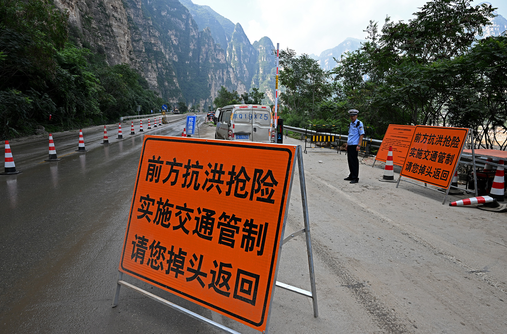 7月29日至8月2日,北京遭遇特大暴雨災(zāi)害,房山區(qū)成為人員財(cái)產(chǎn)損失最嚴(yán)重的地區(qū)之一。張坊檢查崗是進(jìn)入受災(zāi)嚴(yán)重地區(qū)的第一道崗,在被損毀的道路尚未恢復(fù)通行能力前,只有救援相關(guān)車(chē)輛和當(dāng)?shù)卮迕癖辉试S進(jìn)入?!爱?dāng)前首要任務(wù)是保證救援保障力量的順暢進(jìn)出?!比f(wàn)寧大隊(duì)民警宗曉磊告訴記者,從7月28日汛前備勤起,他和同事們就堅(jiān)守在這條進(jìn)山通道,迄今已20多天。