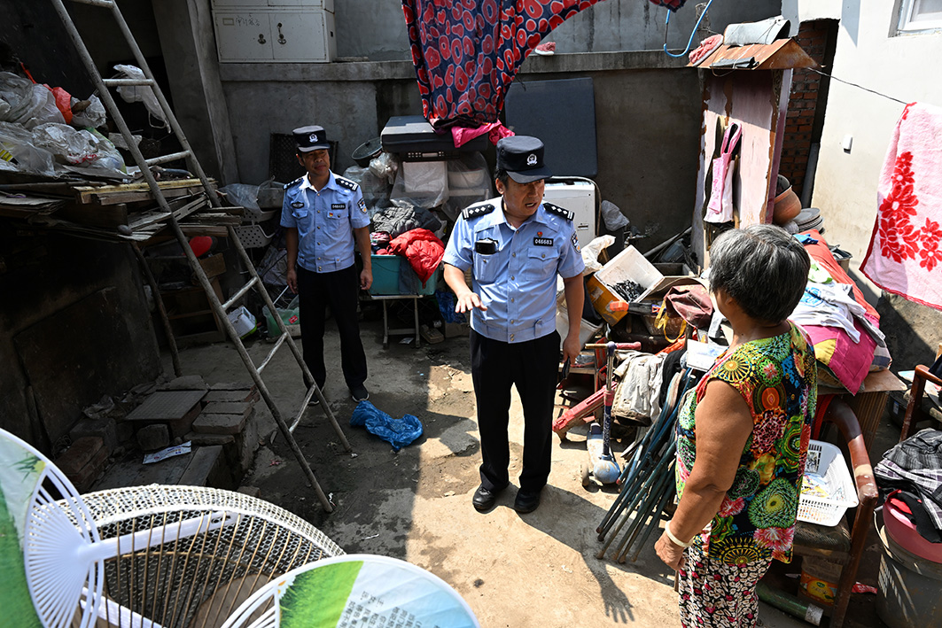 聽(tīng)說(shuō)有群眾陸續(xù)回家,才從救援一線(xiàn)下來(lái)的社區(qū)民警張宗雷和張春江坐不住了。借了分局支援派出所的一輛車(chē),要到自己轄區(qū)的十渡村去看看?!鞍?,我這剛回來(lái),正收拾著屋子呢,你們就過(guò)來(lái)了。見(jiàn)著你們,我這心里就踏實(shí)了?!蹦暧夤畔〉拇迕衤冻隽司眠`的笑容。