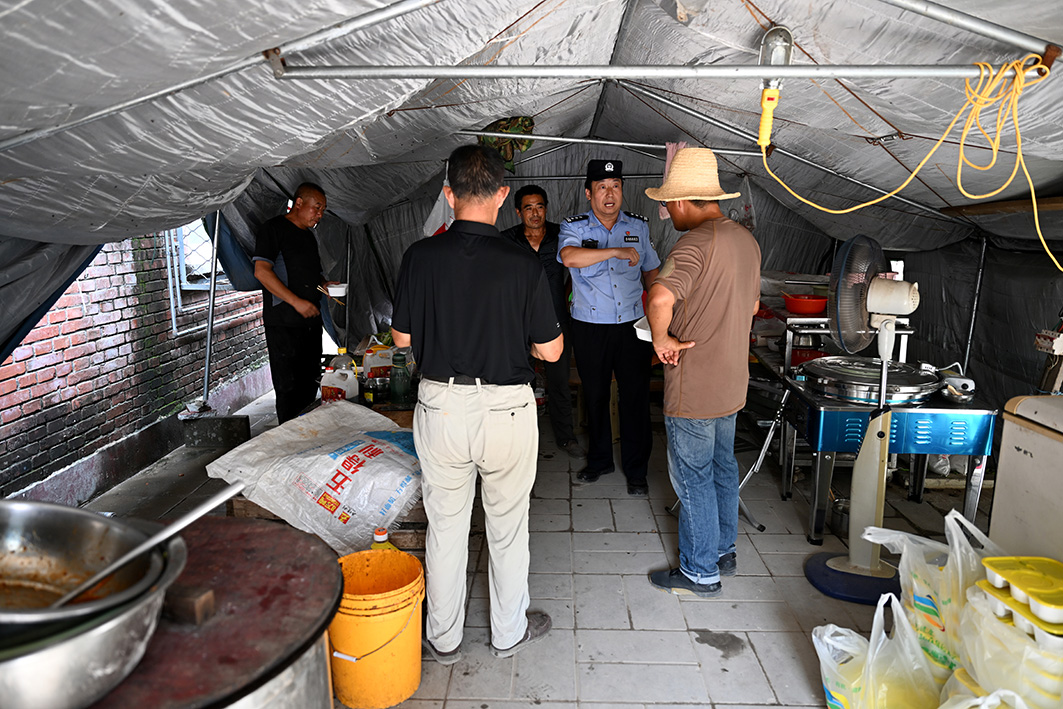 安置點(diǎn)警務(wù)站民警除每日定時(shí)巡邏,還要不時(shí)走訪(fǎng)受災(zāi)群眾,了解情況。