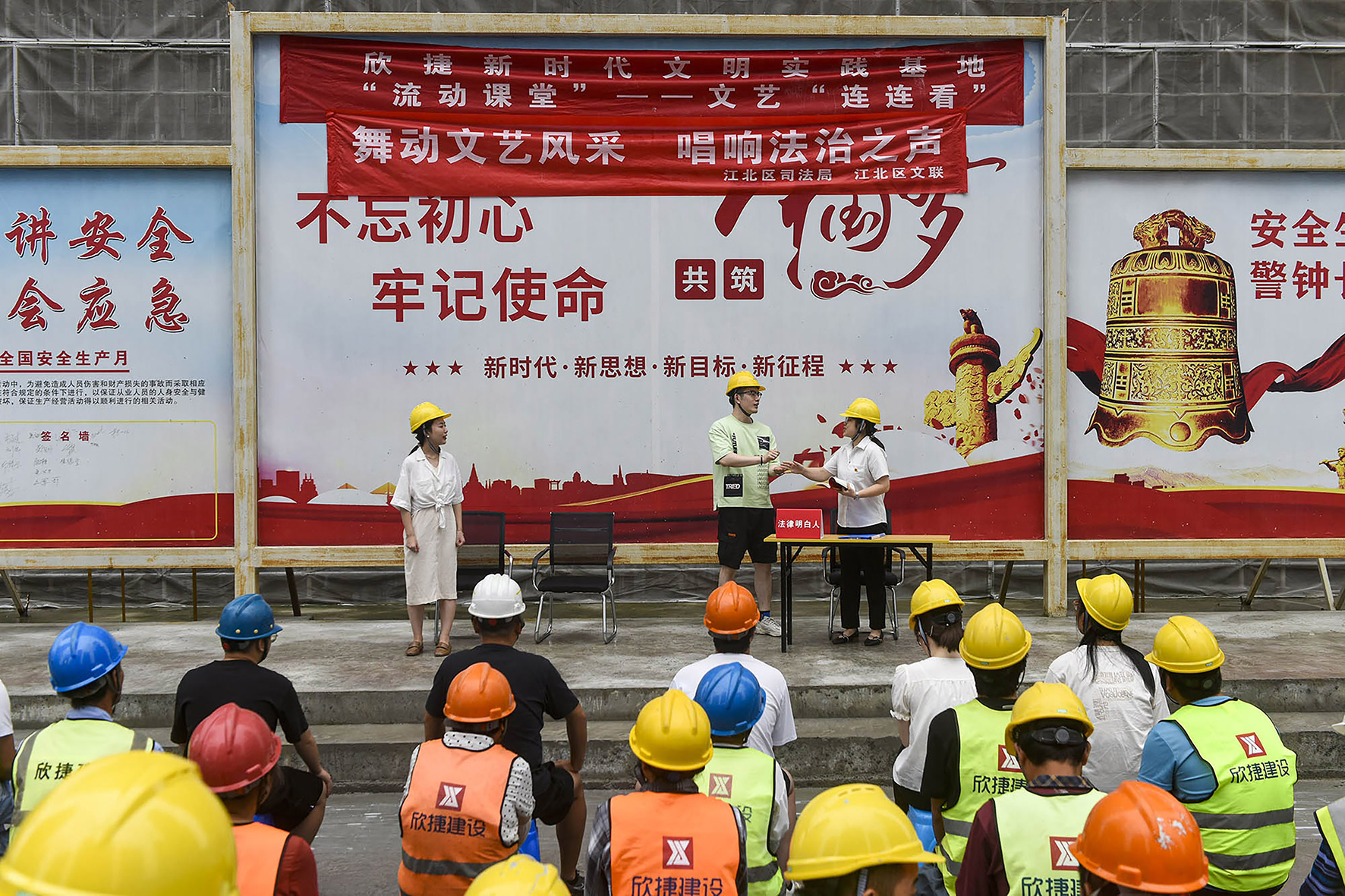 9月14日,浙江省寧波市住建系統(tǒng)組織文藝小分隊和司法工作者來到保障房項目工地,給建筑工人進(jìn)行普法宣傳。