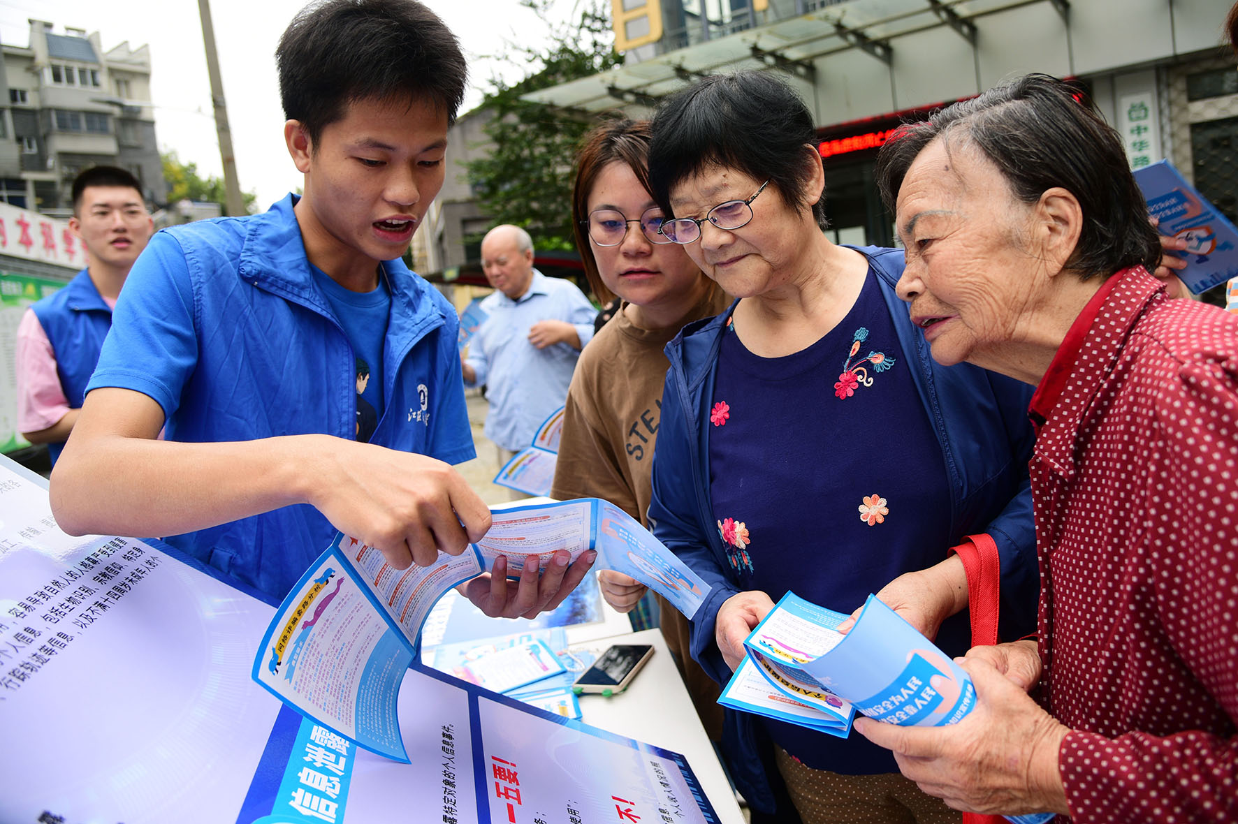 9月16日,在江蘇省鎮(zhèn)江市迎江路中心社區(qū),江蘇科技大學(xué)志愿者向居民宣講網(wǎng)絡(luò)安全與防電信詐騙等知識。