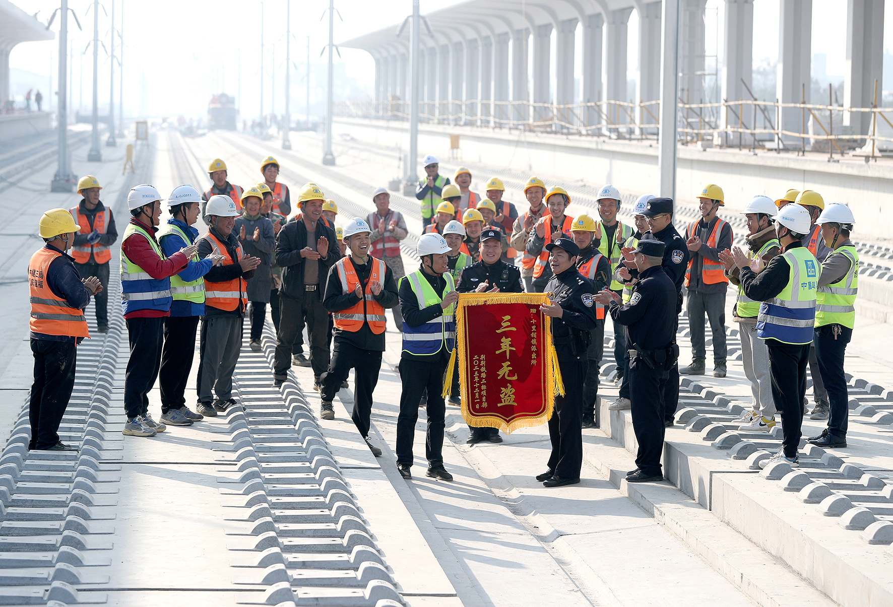 12月5日,在湖北荊荊高鐵沙洋縣十里鋪段建設(shè)工地,項(xiàng)目負(fù)責(zé)人率員工向湖北省沙洋縣公安局十里鋪派出所民警送上一面印有“三年無(wú)盜”的錦旗。