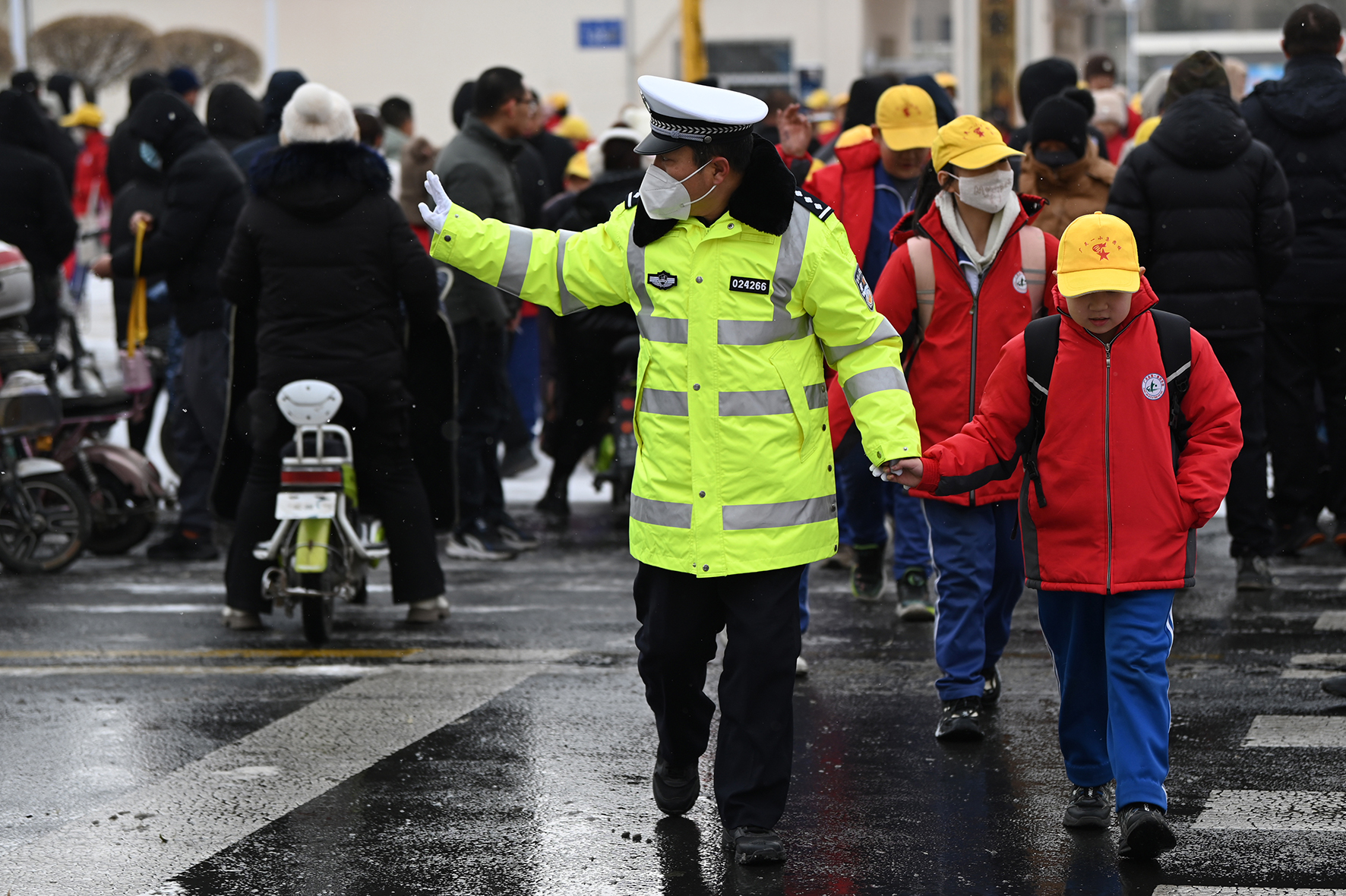 12月13日,山西省大同市廣靈縣公安局交警大隊(duì)民警在第一小學(xué)校門(mén)口護(hù)送學(xué)生放學(xué)。為確保中小學(xué)校師生雪天出行安全,廣靈縣公安局交警大隊(duì)“護(hù)學(xué)崗”的民警們提前到崗,以疏堵保暢、安全巡防、保障交通為主要抓手,確保學(xué)校周邊道路交通秩序良好平穩(wěn)。