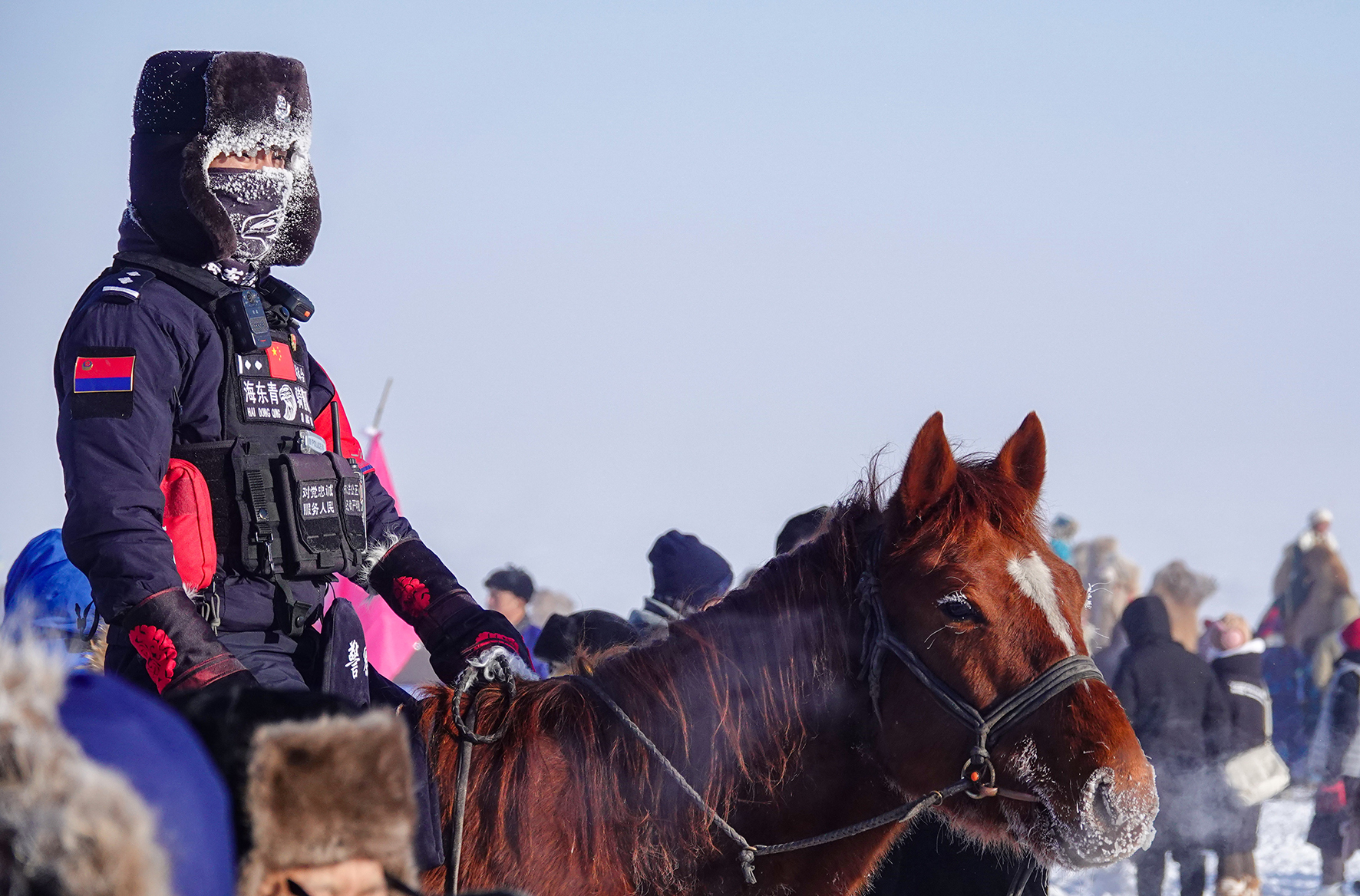 12月17日,內(nèi)蒙古自治區(qū)呼倫貝爾市陳巴爾虎旗公安局海東青騎警隊員在第二十屆冰雪那達(dá)慕大會開幕式現(xiàn)場執(zhí)勤。