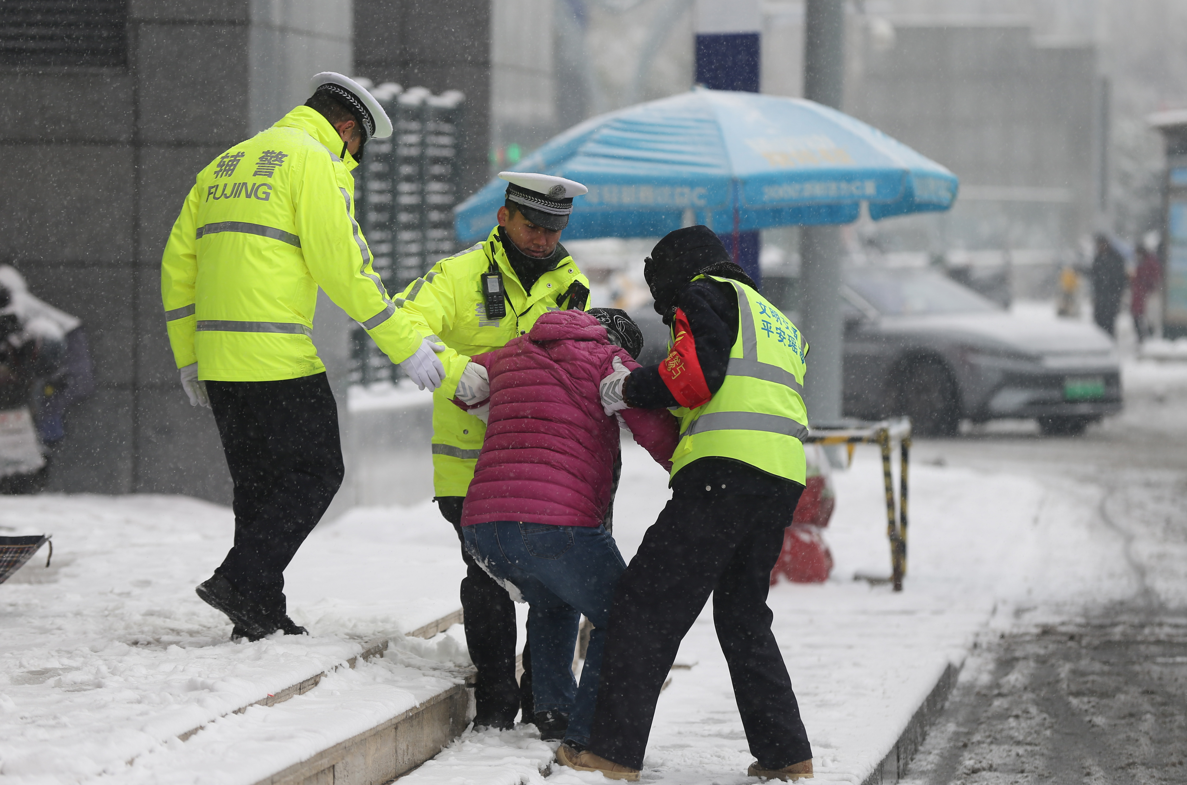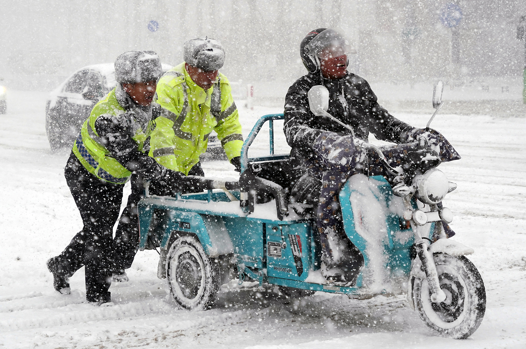 12月16日,山東省煙臺市公安局交警支隊二大隊民警冒雪救助受困車輛。