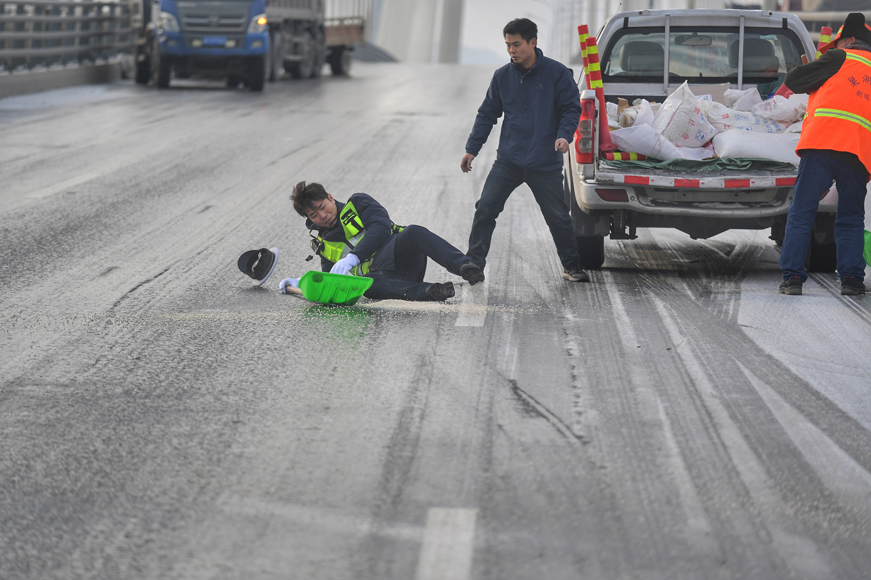 12月16日,安徽省巢湖市公安局交警大隊民警在巢湖大橋撒鹽除冰時因路面濕滑不慎摔倒在地。