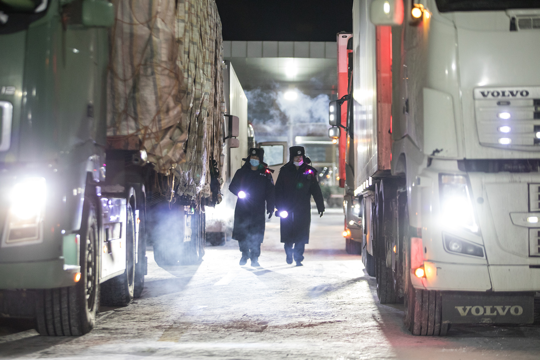 12月16日,內(nèi)蒙古二連浩特公路口岸試行24小時貨運通關(guān)。內(nèi)蒙古出入境邊防檢查總站二連出入境邊防檢查站執(zhí)勤民警,頂著零下31℃的極寒天氣,全力做好車體檢查驗放工作,確保車輛通關(guān)高效順暢。