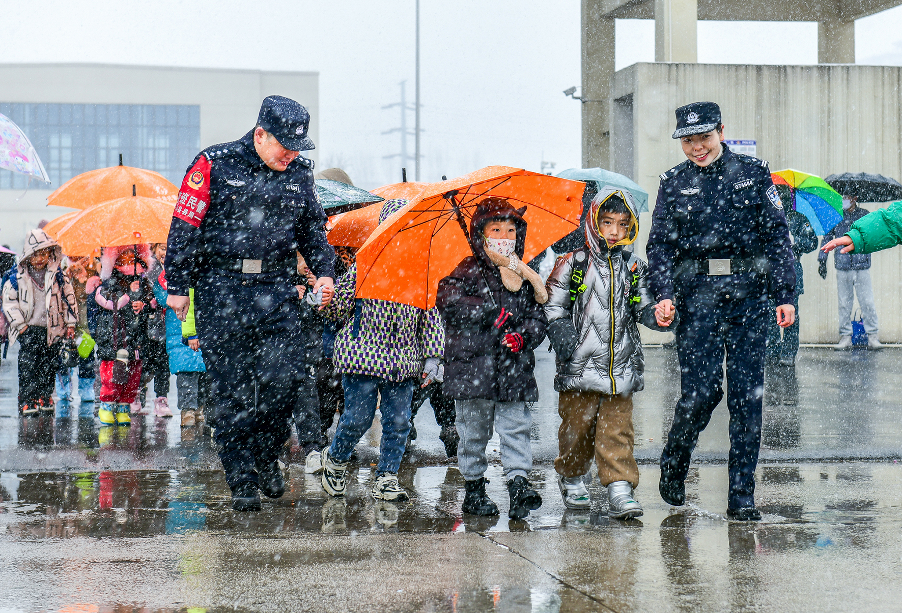 12月18日,安徽省馬鞍山市和縣公安局護學(xué)崗民警正在護送學(xué)生安全放學(xué)。