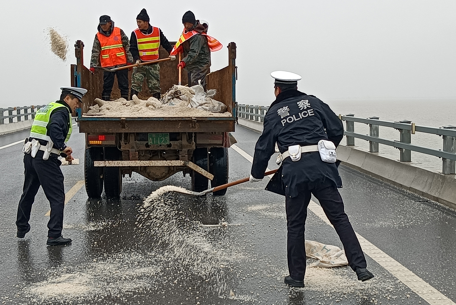 12月18日,安徽省宿松縣全長7832米的黃湖大橋橋面結(jié)冰,宿松縣公安局交警大隊和交通部門立即組織人員在結(jié)冰路段撒鹽融冰,確保省道暢通安全。