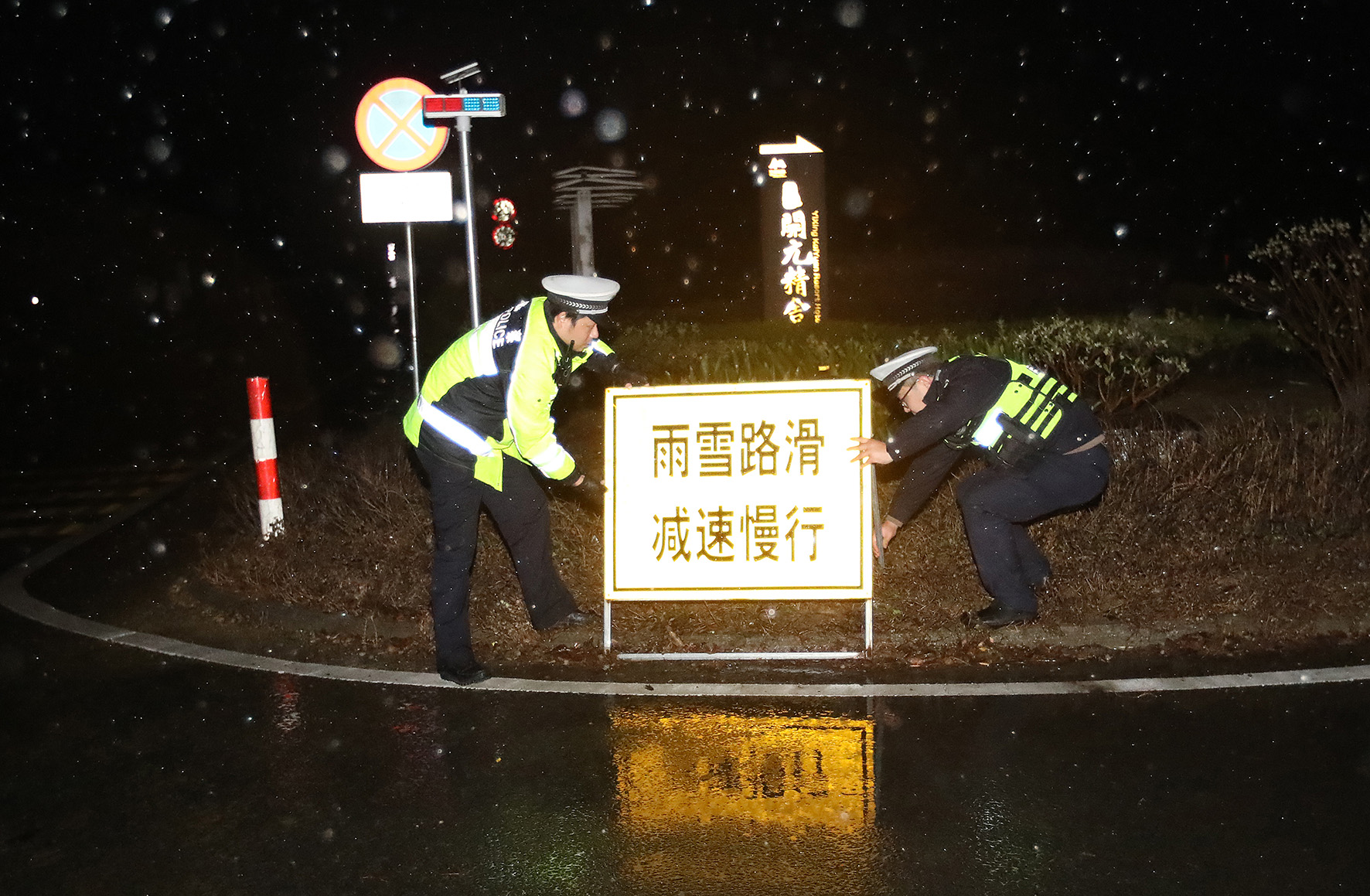 12月15日晚,江蘇省宜興市公安局交警大隊陽羨生態(tài)旅游度假區(qū)中隊民輔警在宜南山區(qū)易積雪、易發(fā)生事故路段設(shè)置警示標(biāo)牌,提醒過往車輛減速慢行。