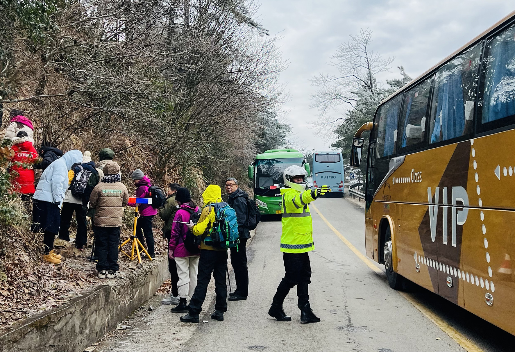 近日,受寒潮影響,浙江省臺(tái)州市天臺(tái)縣石梁鎮(zhèn)千米海拔的華頂山上迎來(lái)首場(chǎng)霧凇美景,吸引了大量不畏嚴(yán)寒前來(lái)觀賞的游客。天臺(tái)縣公安局交警大隊(duì)民輔警堅(jiān)守崗位,加強(qiáng)路面指揮疏導(dǎo),確保景區(qū)道路安全暢通,全力守護(hù)游客出行安全。
