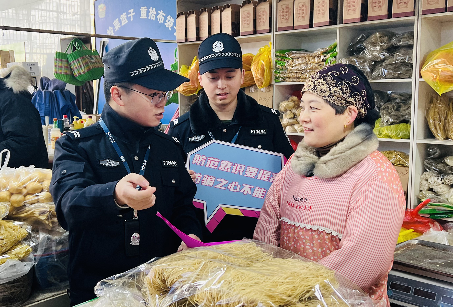 圖為12月21日,民輔警在平橋鎮(zhèn)八角亭村向沿街商戶宣講反詐知識(shí)。