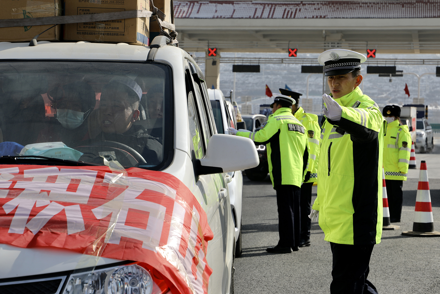 圖四:12月21日,民輔警在積石山臨大高速路口疏導(dǎo)交通,保證車輛有序通行。