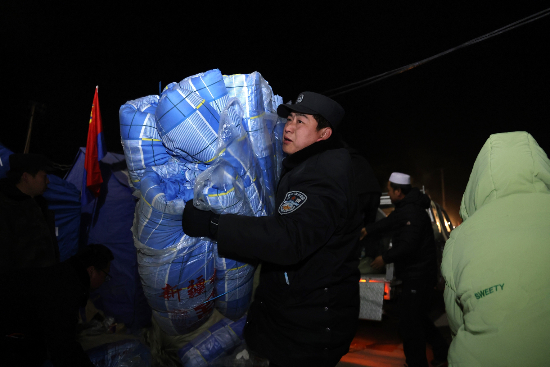 圖三:12月20日22時許,民輔警搬運(yùn)救災(zāi)物資。