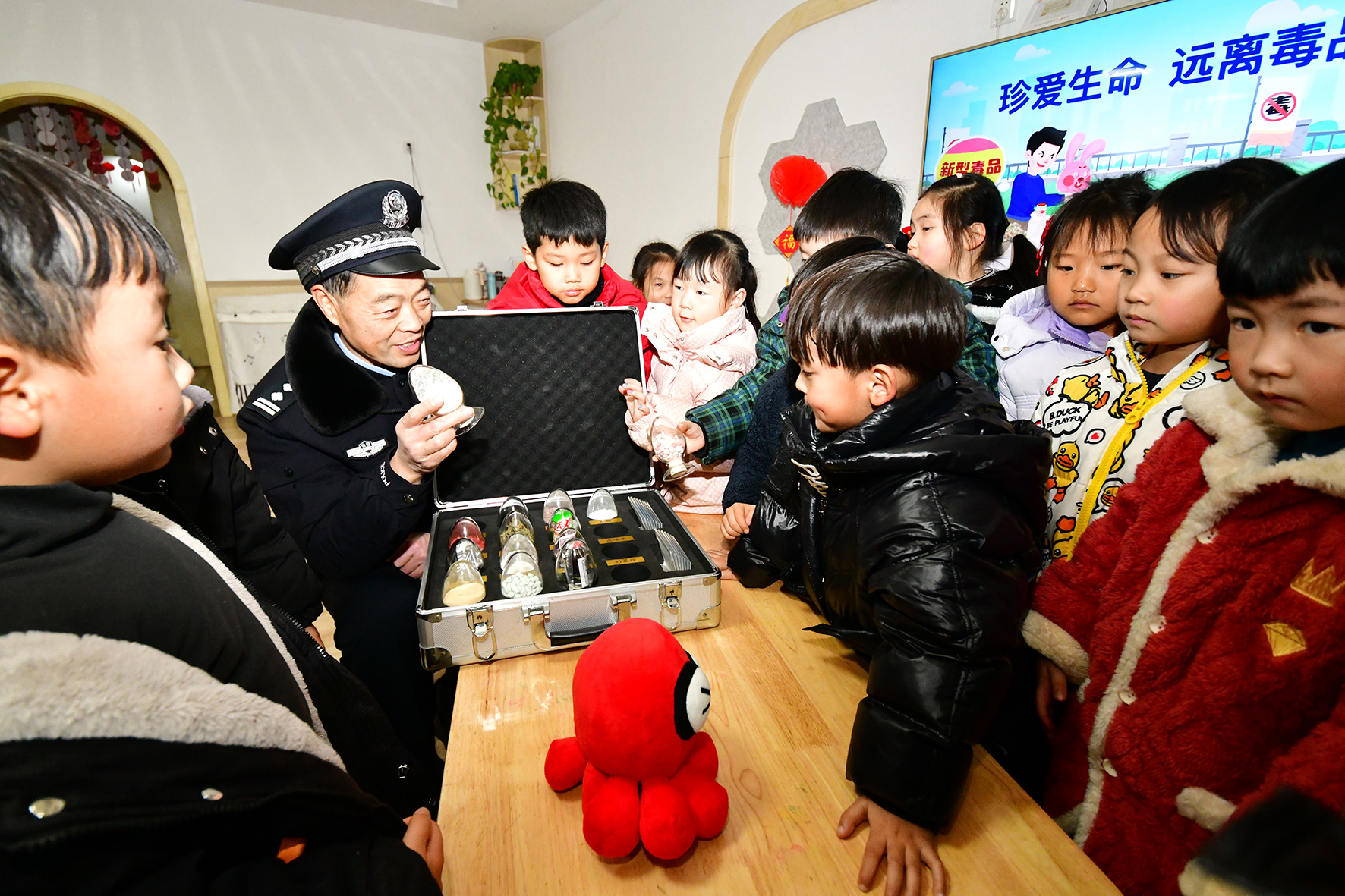 1月17日,安徽省阜南縣公安局城關(guān)派出所民警在鹿城幼兒園向孩子們講解如何辨別毒品。寒假臨近,阜南縣公安局城關(guān)派出所組織民輔警走進(jìn)轄區(qū)中小學(xué)校及幼兒園開展“珍愛生命 遠(yuǎn)離毒品”宣傳活動(dòng)。
