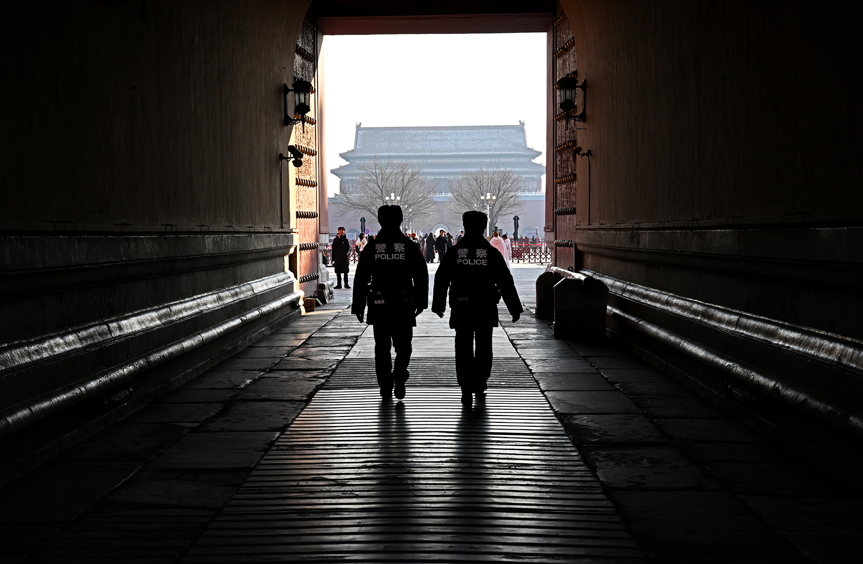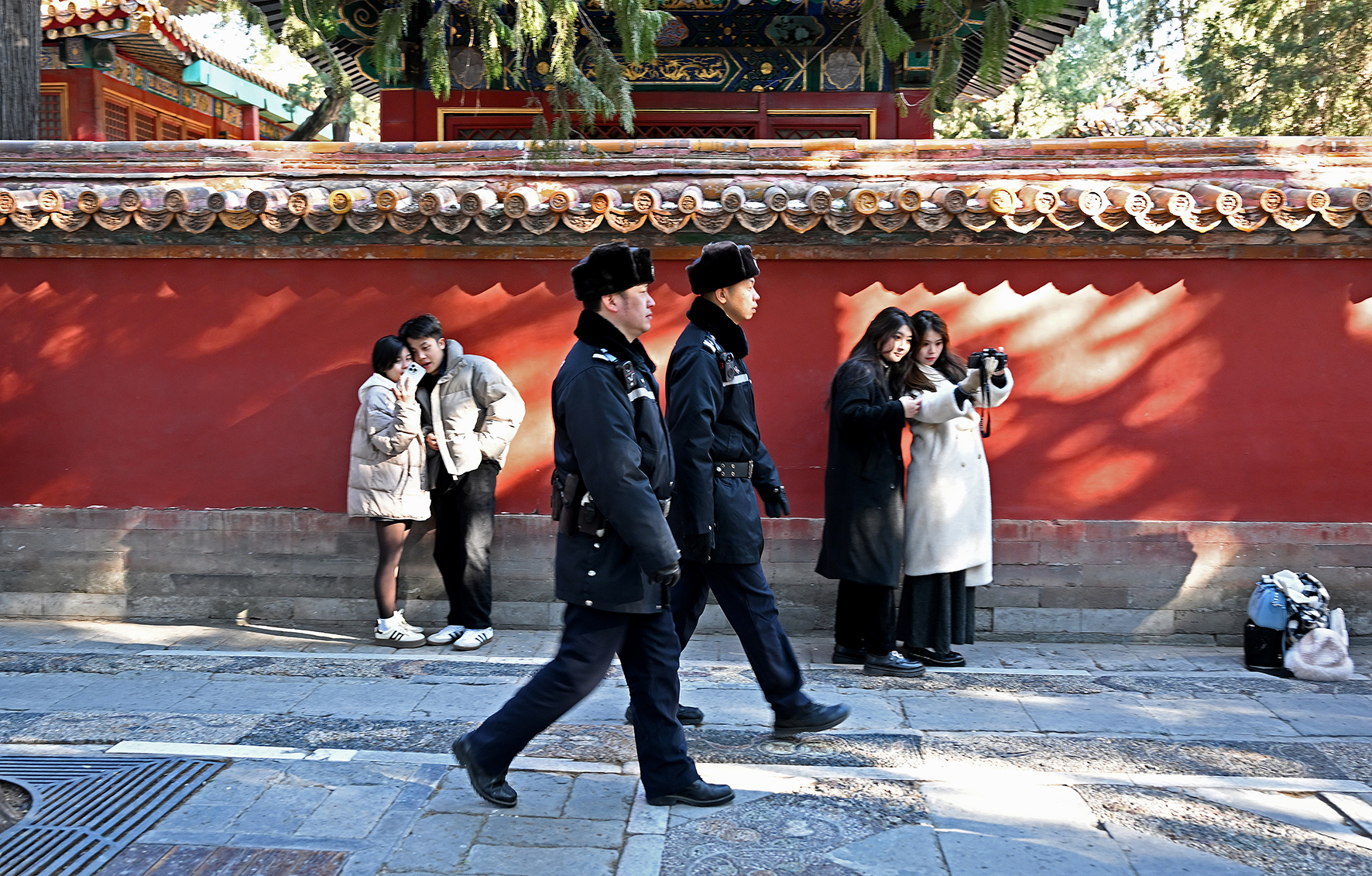 民警劉培與同事在午門巡查。劉培說,他們平均每天要走2萬多步,最多時(shí)超過3萬步。