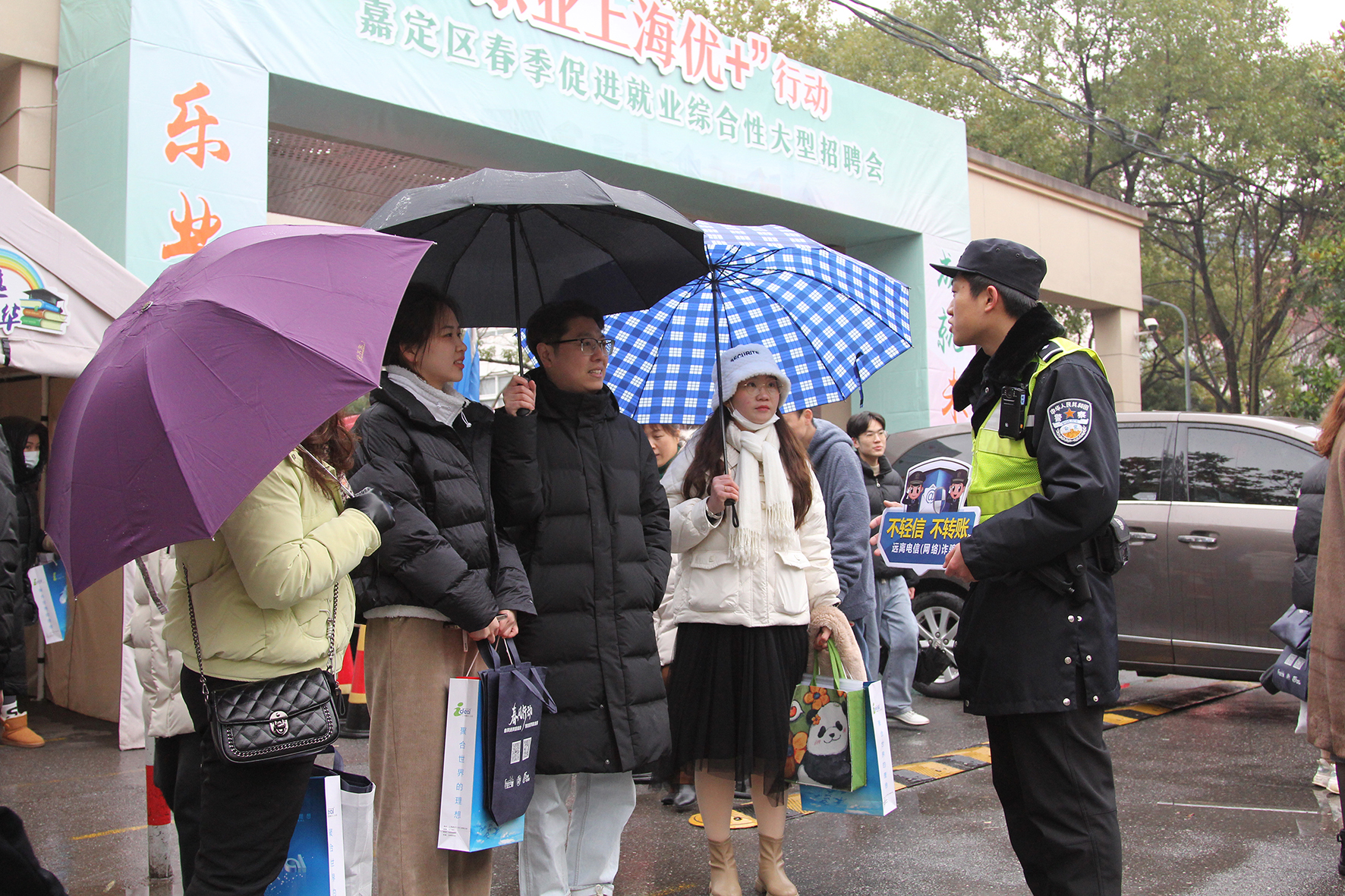 2月24日,上海市公安局嘉定分局民警冒雨在春季招聘會現(xiàn)場開展反電信網(wǎng)絡(luò)詐騙、交通安全等知識宣傳。