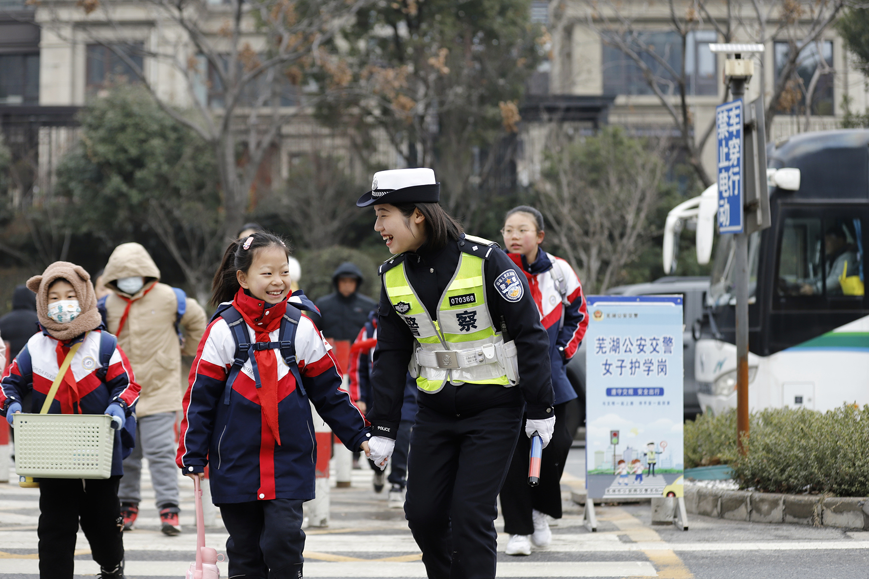 2月26日,安徽省蕪湖市弋江大隊(duì)女子護(hù)學(xué)崗民警在安師大附屬小學(xué)(西校區(qū))護(hù)送上學(xué)孩子過(guò)馬路,確保學(xué)生上放學(xué)安全。