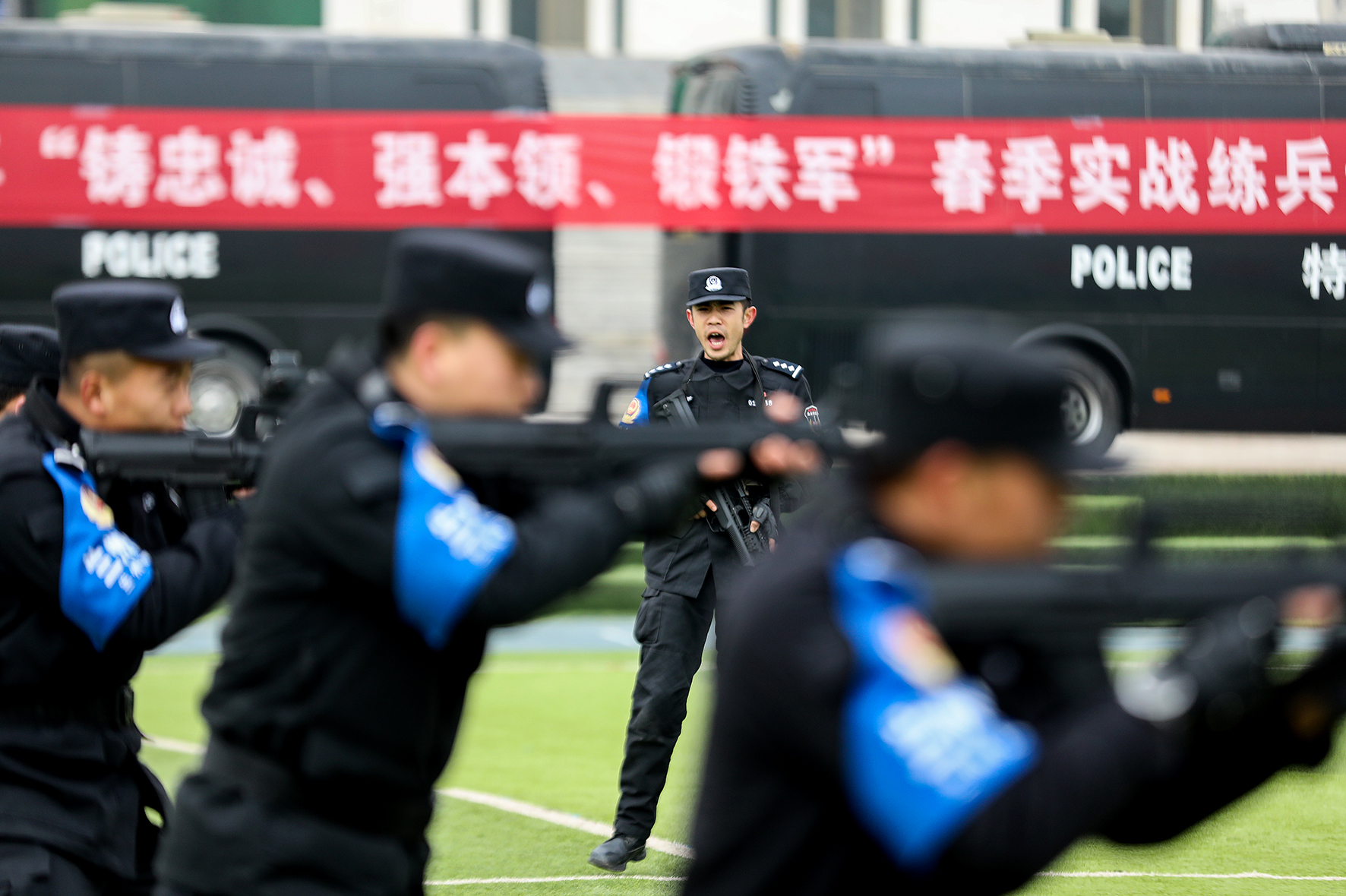 2月27日,甘肅蘭州市公安局特警隊伍開展春季實戰(zhàn)訓(xùn)練,百名特戰(zhàn)隊員在訓(xùn)練場上開展持槍戰(zhàn)術(shù)動作、突擊攻堅戰(zhàn)術(shù)、盾棍叉小組戰(zhàn)術(shù)、無人機(jī)操作、體能對抗等多項警事技能訓(xùn)練,拉開2024春季大練兵序幕。