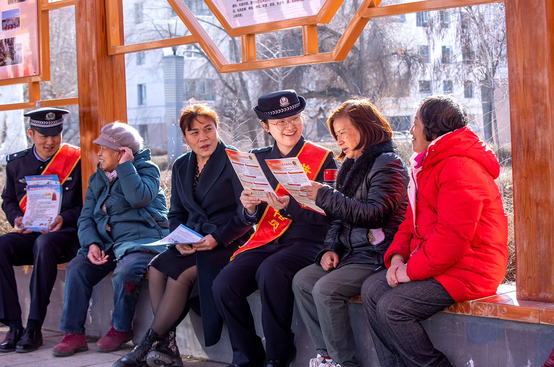 3月7日,湖北省荊門市公安局巡特警支隊(duì)蘇畈橋警務(wù)站女民警在沿河社區(qū),向居民普及婦女、兒童權(quán)益保護(hù)相關(guān)法律知識。