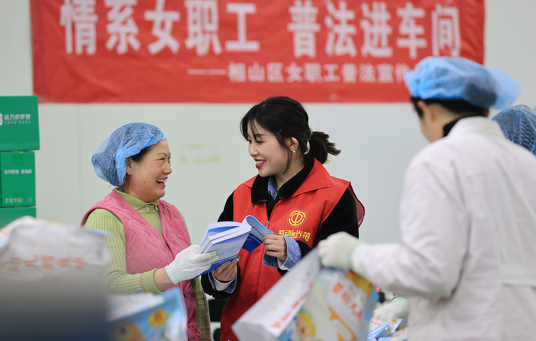 3月6日,安徽省淮北市相山區(qū)總工會普法志愿者在企業(yè)車間內(nèi),向女職工宣傳法律知識和企業(yè)安全生產(chǎn)知識。