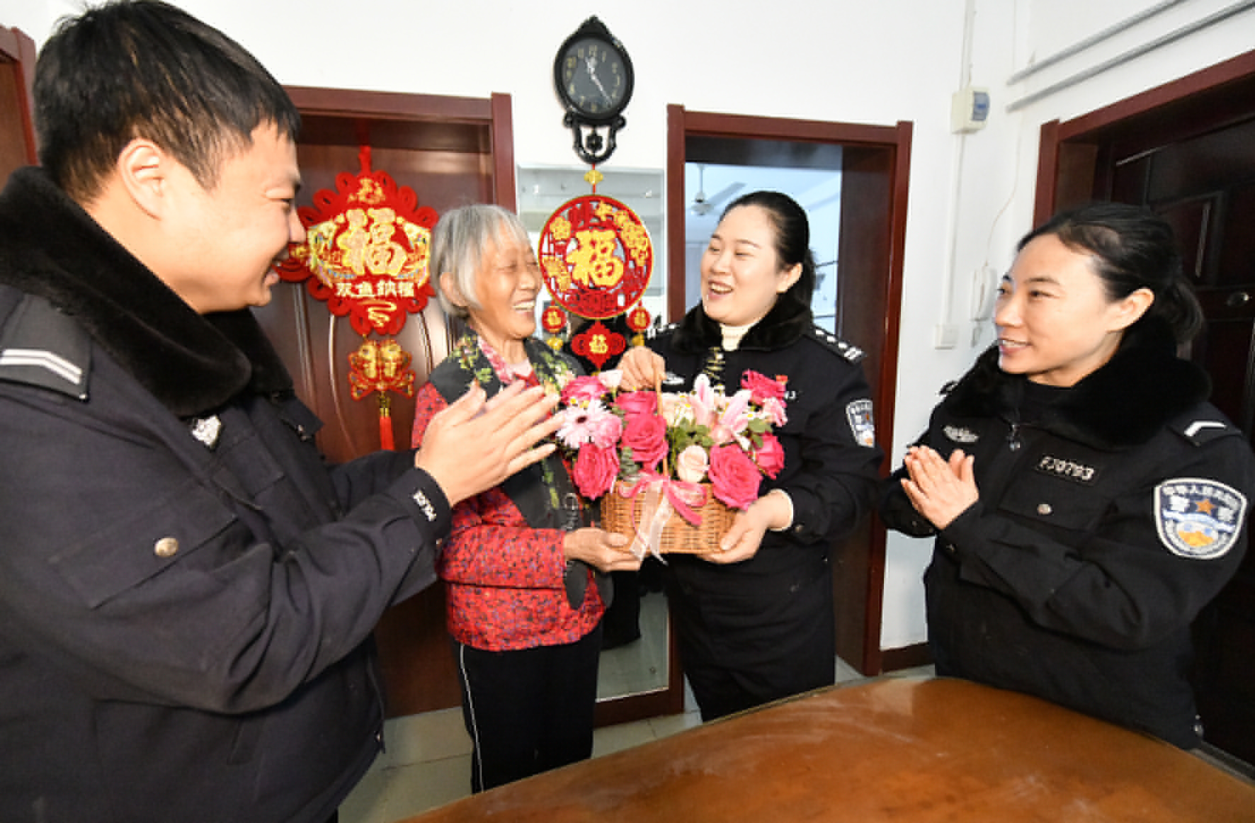 3月7日,河南省鄭州市公安局金水分局巡特警與人民路派出所的民輔警看望81歲的治安先進(jìn)個人吳大媽,并送上節(jié)日的問候。