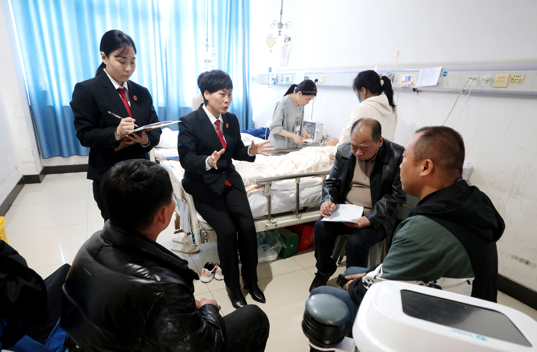 圖為法官與人民調(diào)解員在病房內(nèi)組織調(diào)解。