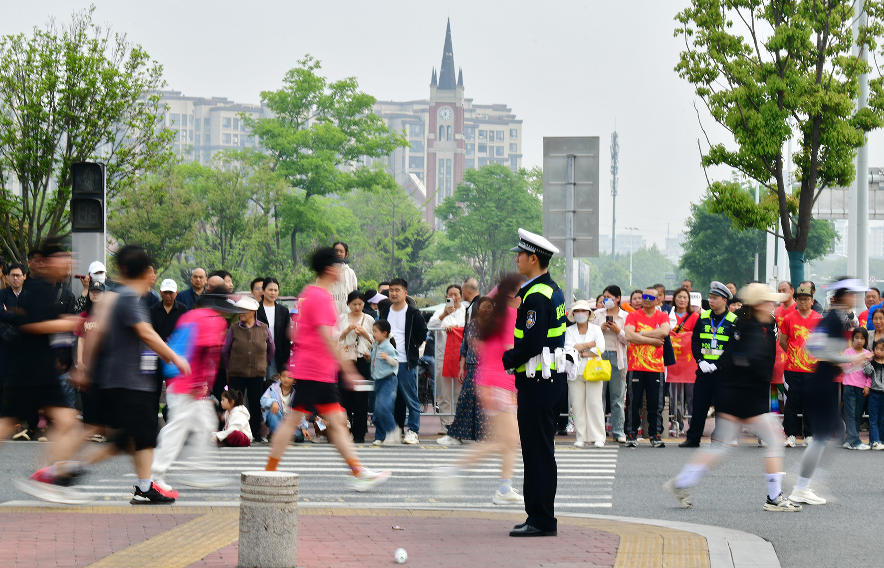 4月21日,安徽省阜陽市公安機關(guān)民輔警在阜陽馬拉松比賽現(xiàn)場維持秩序。