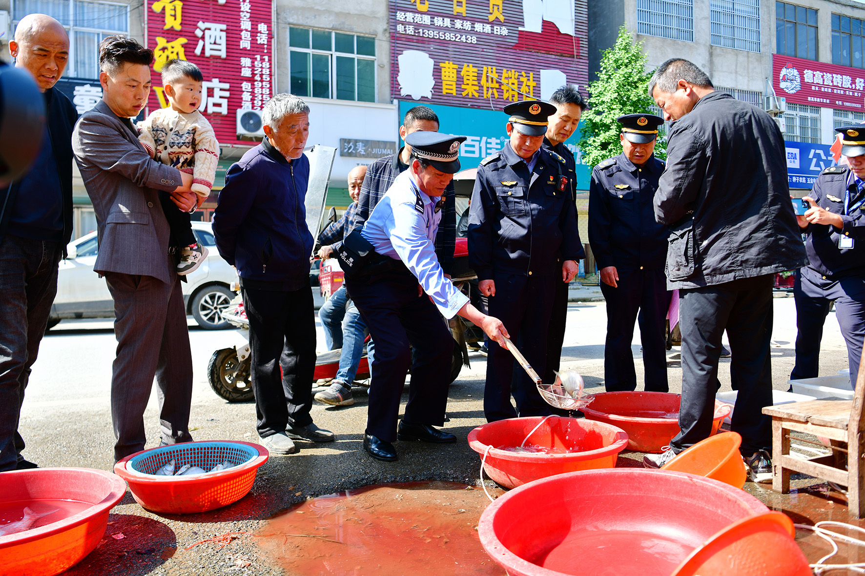 5月1日,安徽省阜南縣公安局安崗派出所民警聯(lián)合農(nóng)業(yè)執(zhí)法人員在位于淮河岸邊的曹集鎮(zhèn)農(nóng)貿(mào)市場開展檢查。