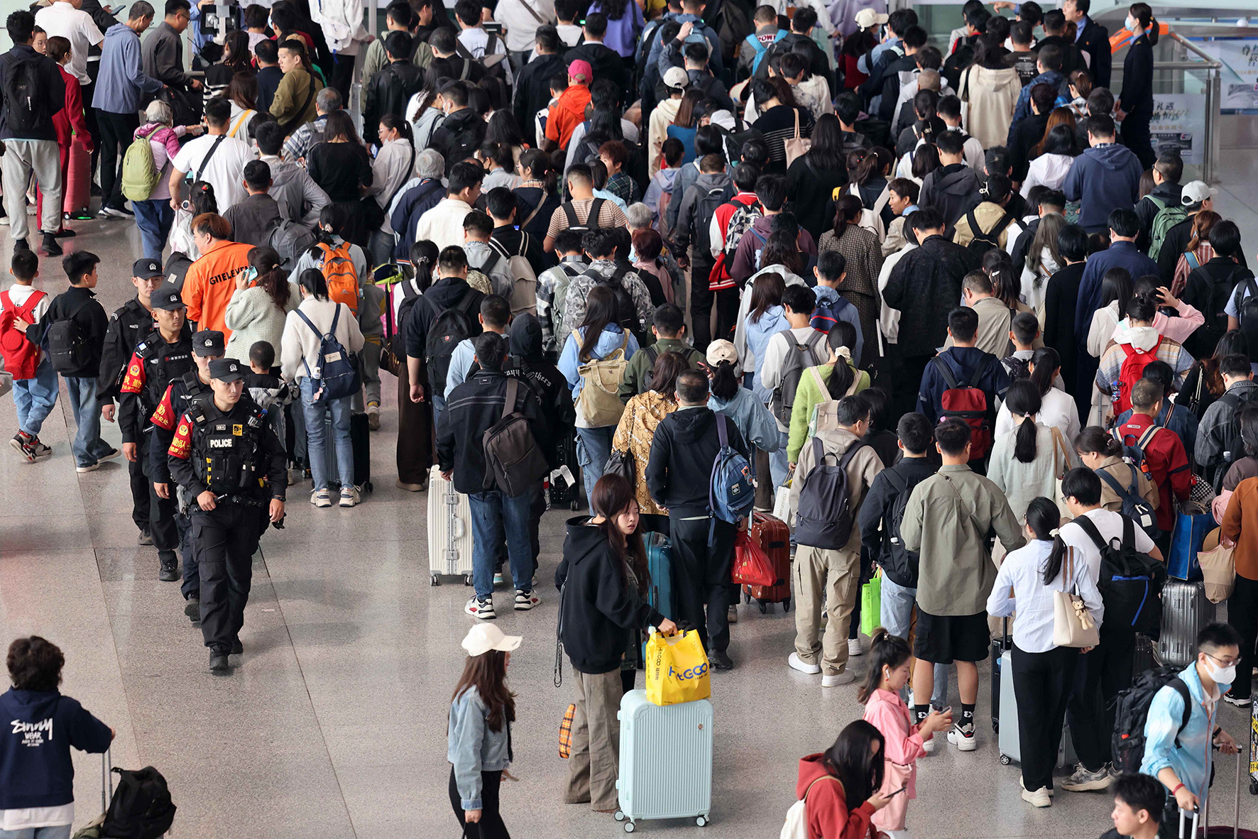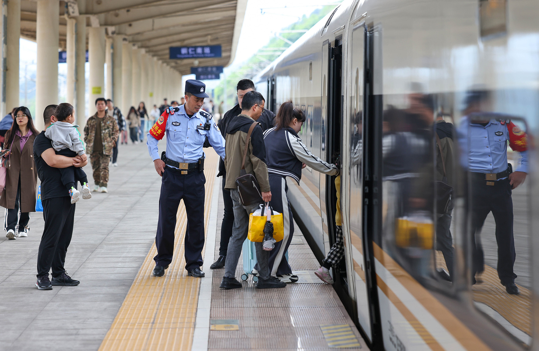 5月1日,在滬昆高鐵貴州銅仁南站,成都鐵路公安局貴陽公安處銅仁南車站派出所民警在引導(dǎo)旅客乘車。