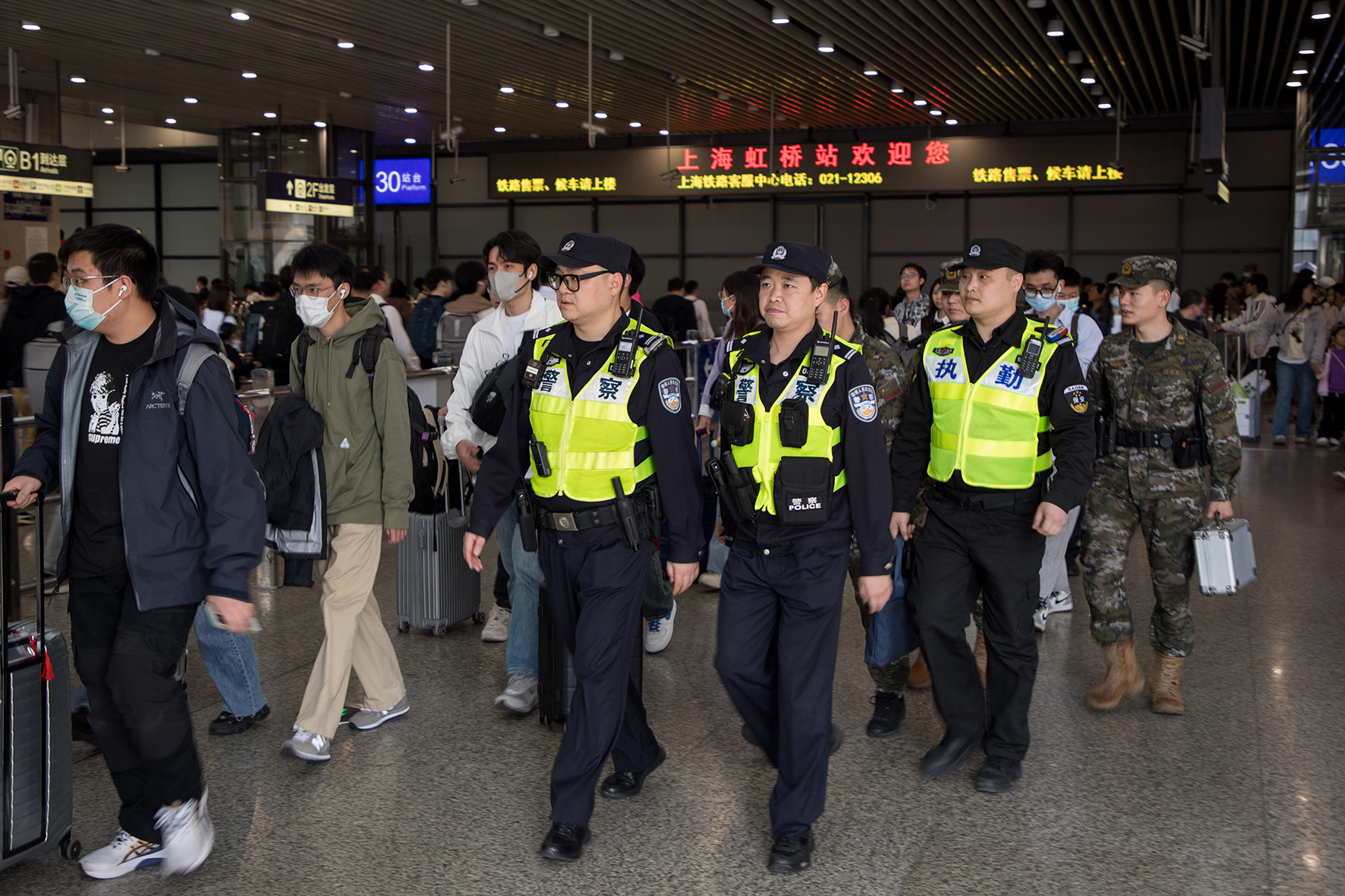 5月4日,針對虹橋火車站超60萬人次的到發(fā)旅客人數(shù),上海市公安局閔行分局增派警力開展步巡,提升應(yīng)急處突和服務(wù)群眾的能力。