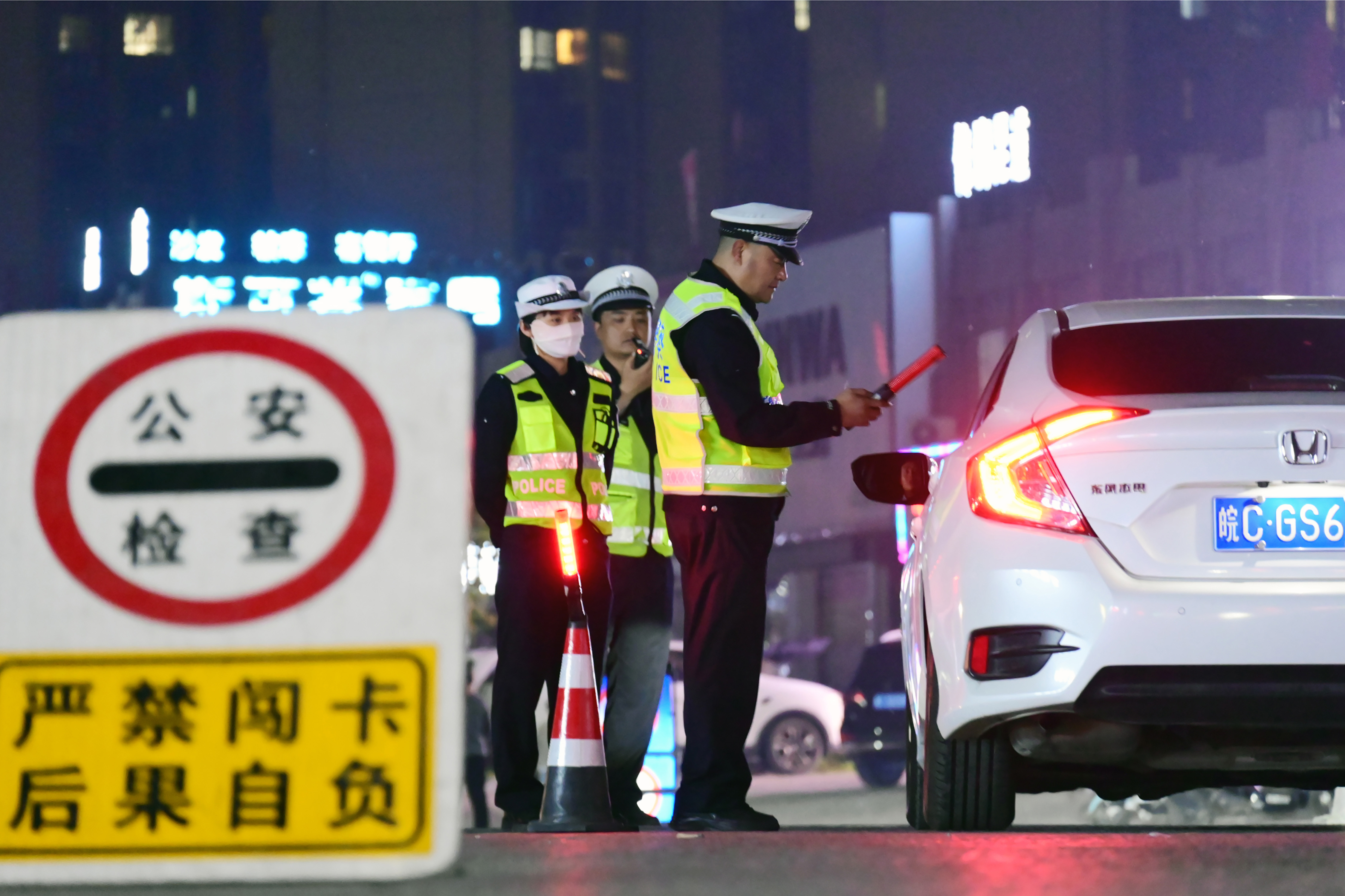 5月5日,安徽省固鎮(zhèn)縣公安局交管大隊(duì)民輔警在立新路夜查酒駕違法行為。