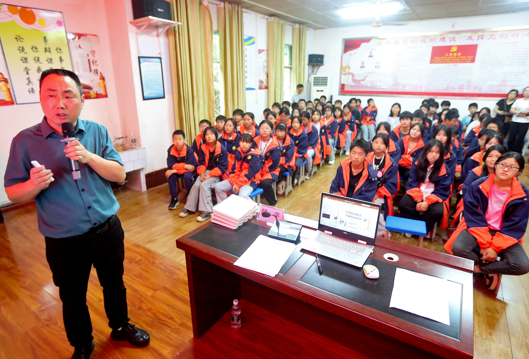 圖為5月9日,四川省華鎣市的律師志愿者在雙河四中向學生宣講反欺凌相關法治知識。