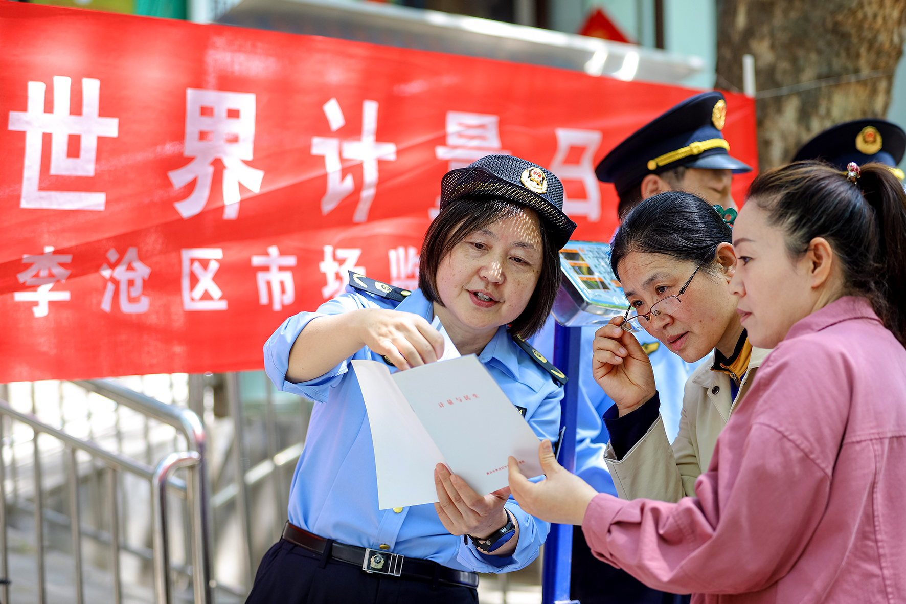 圖為5月17日,執(zhí)法人員在李村街道向陽(yáng)路社區(qū)向市民介紹計(jì)量知識(shí)。