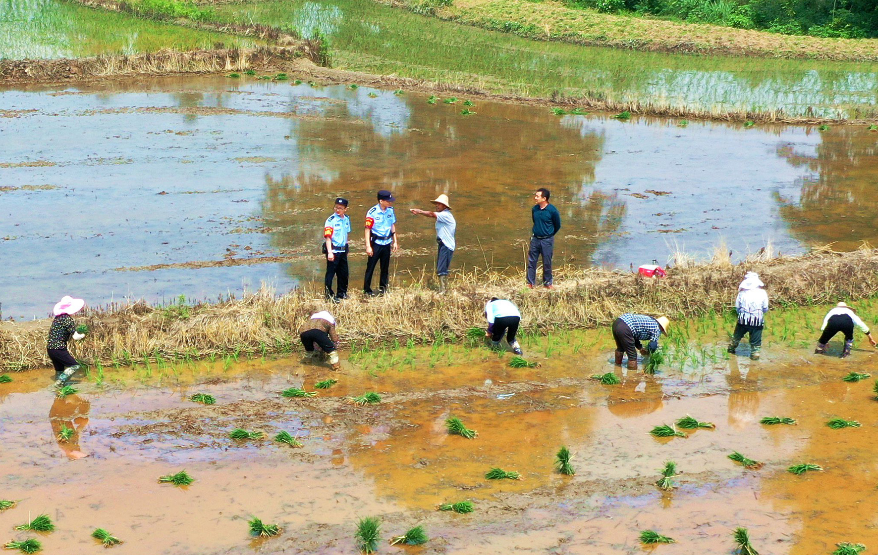 6月7日,安徽省舒城縣公安局張母橋派出所民警深入轄區(qū)農(nóng)林村田間,與栽種水稻秧苗的村民交流了解治安情況?!叭摹睍r節(jié),張母橋派出所民警以“田間警務(wù)”為著力點,深入田間地頭,開展巡邏、防范盜竊、現(xiàn)場化解糾紛等工作,為農(nóng)忙保駕護(hù)航。