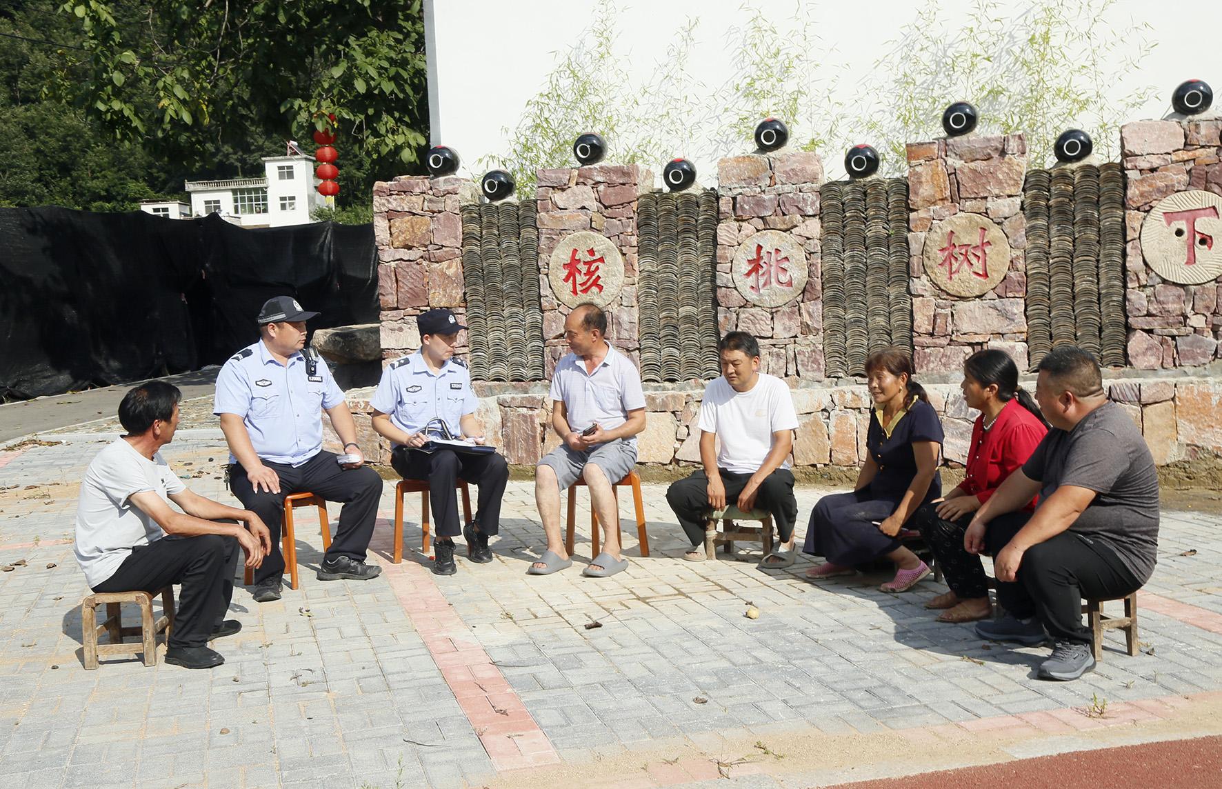 圖為8月6日,汝陽(yáng)縣公安局靳村派出所民輔警和鄉(xiāng)平安建設(shè)辦公室工作人員在石寨村與群眾座談,了解情況征詢(xún)意見(jiàn)。