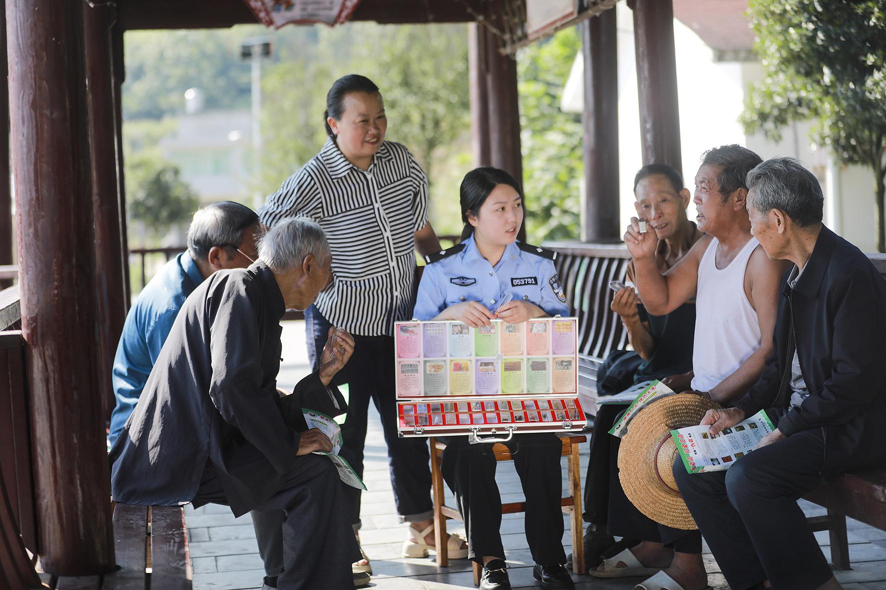 8月15日,貴州省黔西市公安局民警來到永燊苗族彝族鄉(xiāng)茨落村,向村里的老人們宣傳禁毒、防范非法集資、防范養(yǎng)老詐騙等知識,提升老人們的安全防范意識。