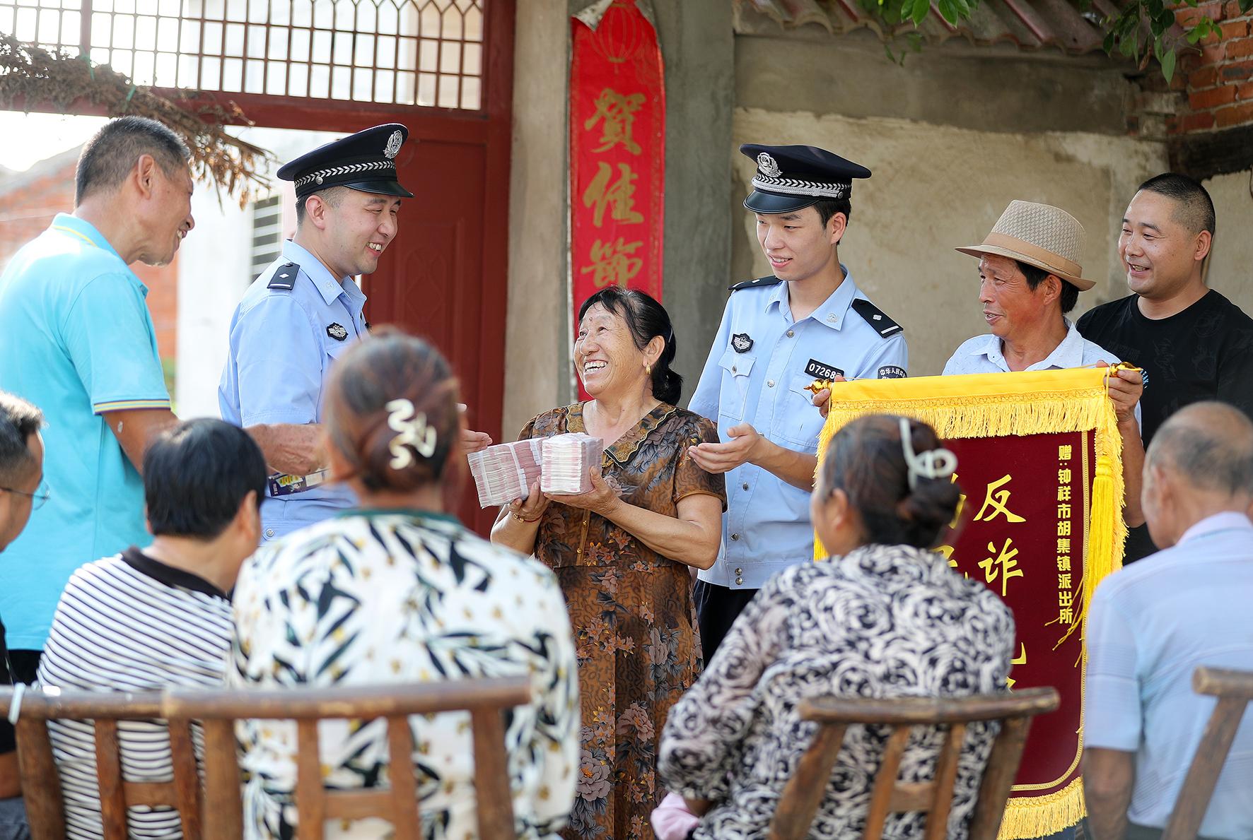 圖為8月22日,鐘祥市公安局胡集派出所民警在胡集鎮(zhèn)麗陽村,上門退還電信詐騙受害人20萬元被騙款,并陪同受害人“現(xiàn)身說法”,向村民講述被騙經(jīng)歷,讓村民識破電信詐騙伎倆,遠(yuǎn)離電信詐騙。