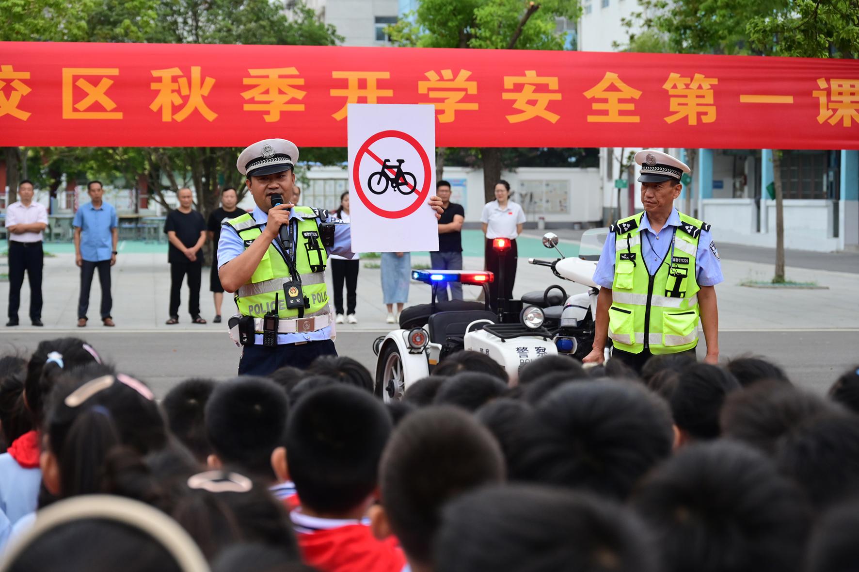 9月2日,安徽省阜南縣公安局交管大隊(duì)民輔警走進(jìn)轄區(qū)中小學(xué)校,開(kāi)展“知危險(xiǎn)、避危險(xiǎn)”交通安全開(kāi)學(xué)第一課活動(dòng)。